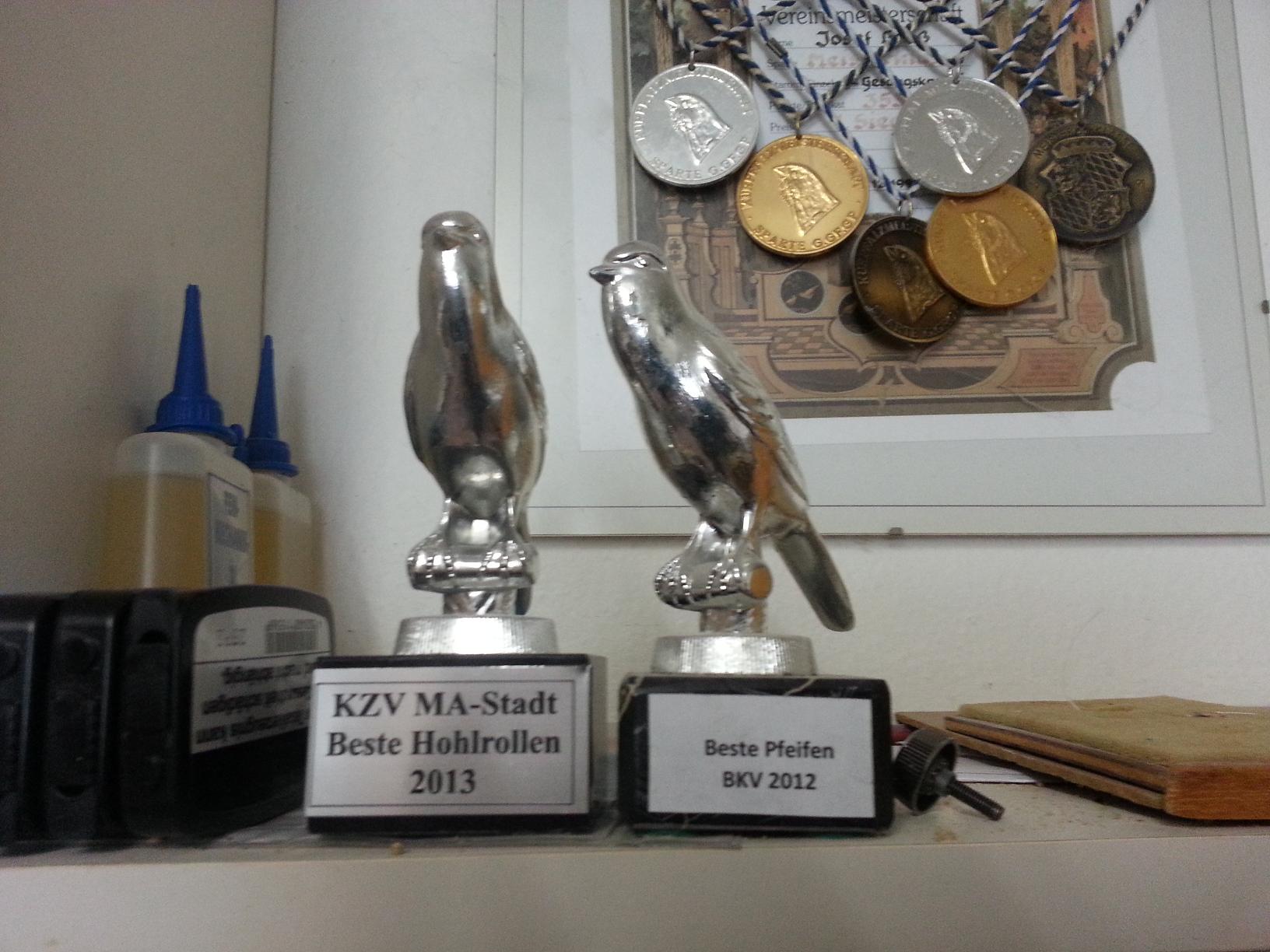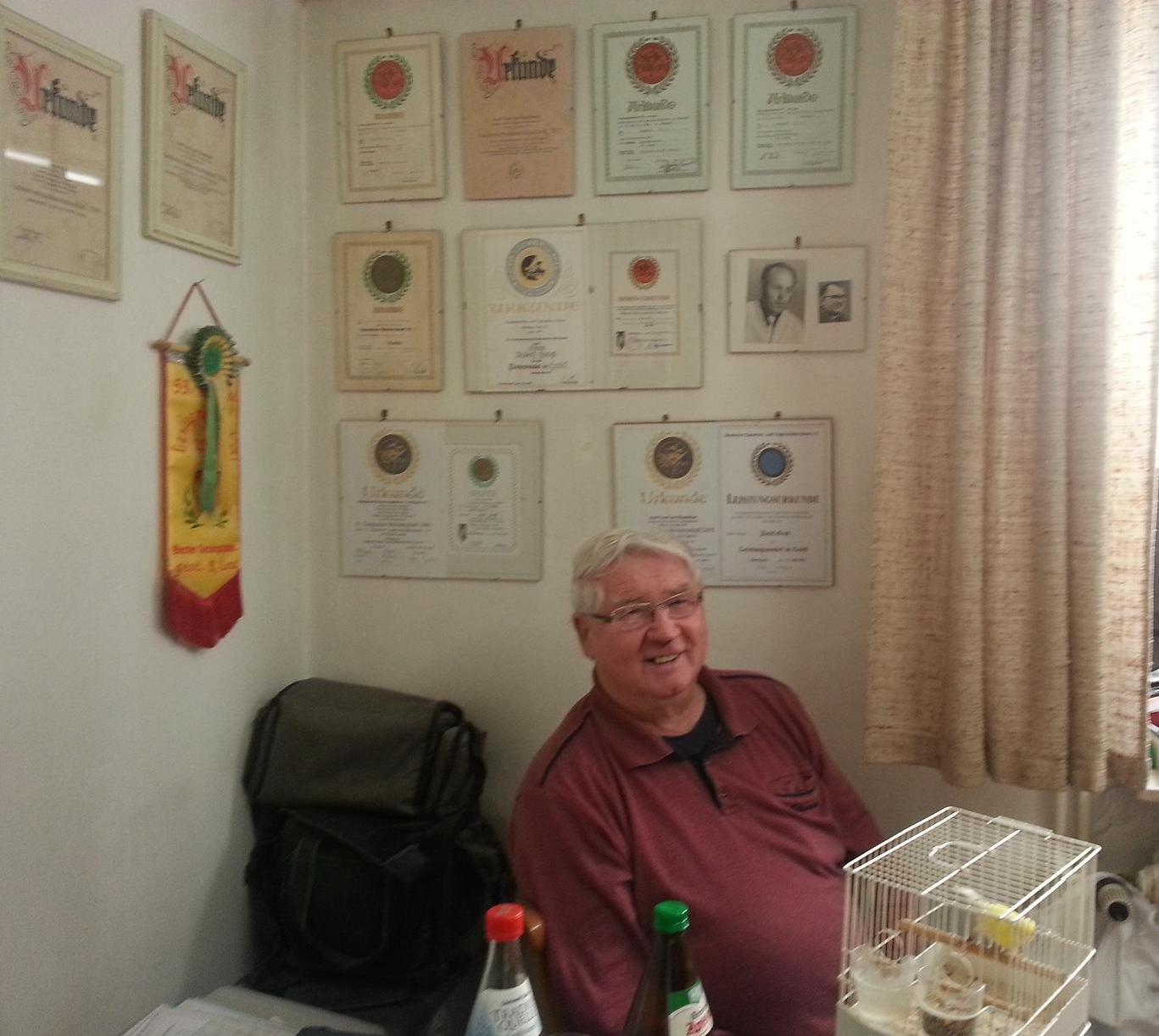 Йозеф Гросс - разводчик гарцких (немецких) роллеров. Разводит он эту породу уже далеко не один десяток лет. Причём в его хозяйстве только роллеры . Перечень его побед и достижений, уверена, не уместятся на одном листе. Полученные на различного уровня выставках кубки, медали, статуэтки уже давно не помещаются в одной комнате. Господин Грос даже пошутил, что жена уже ругает его и он вынужден для них "арендовать " часть ее территории в доме )))). А грамот и различного рода благодарностей хватит на поклейку стен в птичьей комнате , вместо обоев.