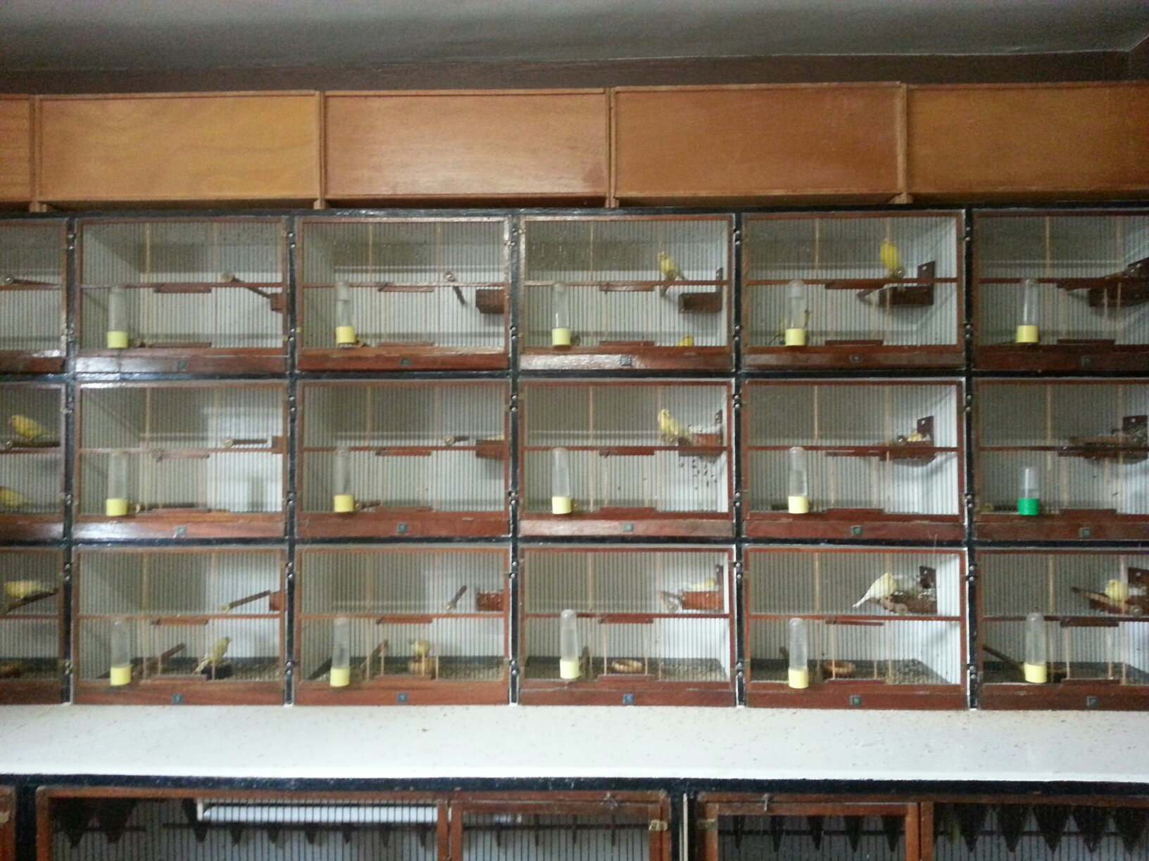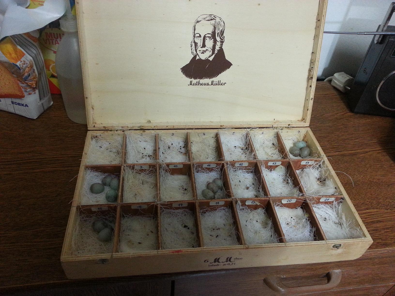 И пока самочка не закончит кладку, яйца будут ежедневно перемещаться в эту "шкатулку", в строго определенную , пронумерованную для каждого гнезда ячейку. А вместо них в гнездо будут подкладываться взамен настоящих приближенные по размеру муляжи: [hide][attachment=4]20140304_145552.jpg[/attachment][/hide]Ну, и поскольку гарцкий роллер - это все-таки певчая канарейка, и самое важный показатель - это ее песня, никак не обойтись без такого шкафа , где за закрытой шторой в маленьких клеточках сидят будущие и настоящие певцы : [hide][attachment=2]20140304_145453.jpg[/attachment][/hide]