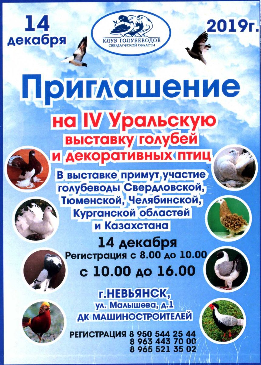 14 декабря 2019 г., Свердловский областной Клуб голубеводов планирует проведение IV Уральской региональной выставки голубей и певчих птиц.
