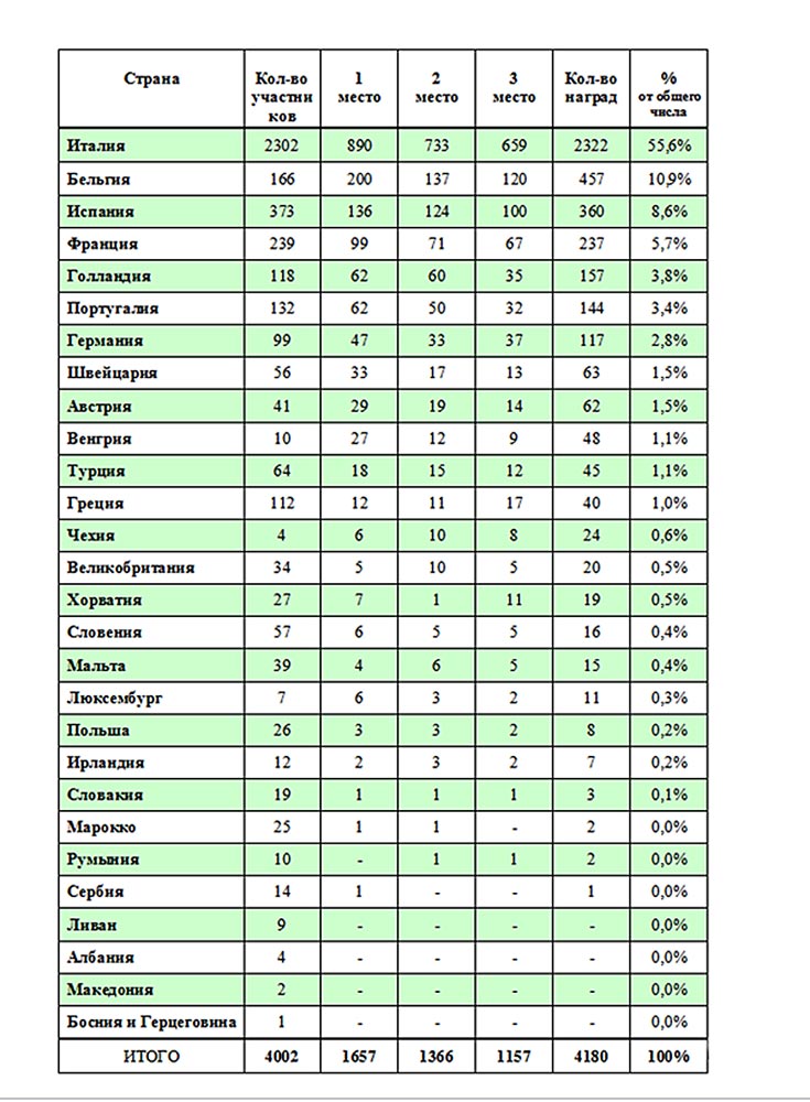 Вполне прогнозировано Италия выигрывает Чемпионат с 2322 медалями, а это более 55 % всех наград.