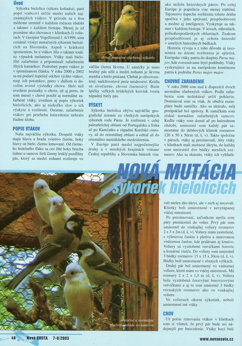 В немецком журнале Vogelfreund, №6, 1999, автор статьи впервые поделился информацией о появлении мутационных больших синиц в Словакии. Птицы отличались отсутствием меланина, по окрасу были скорее бело-желтые, чем напоминали желтых канареек. К сожалению, фотографии иллюстрирующие статью маленькие и не очень хорошего разрешения.