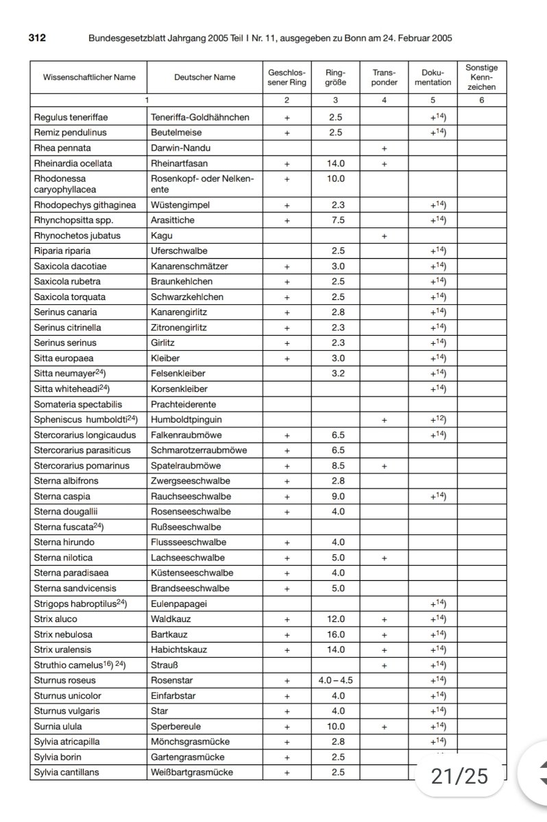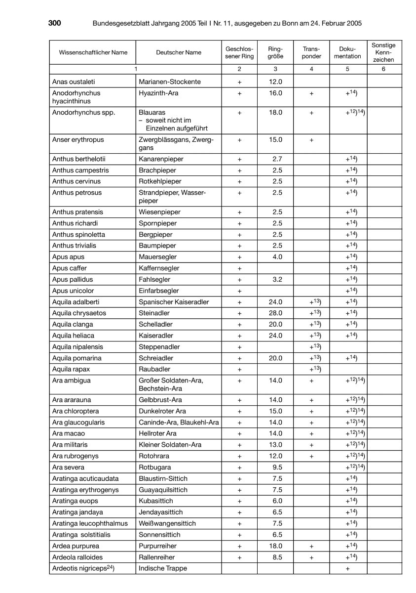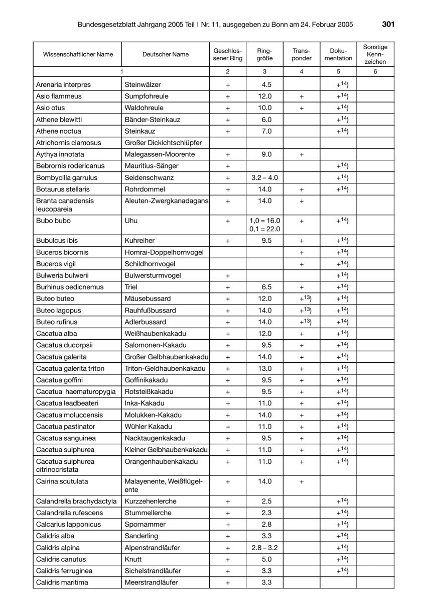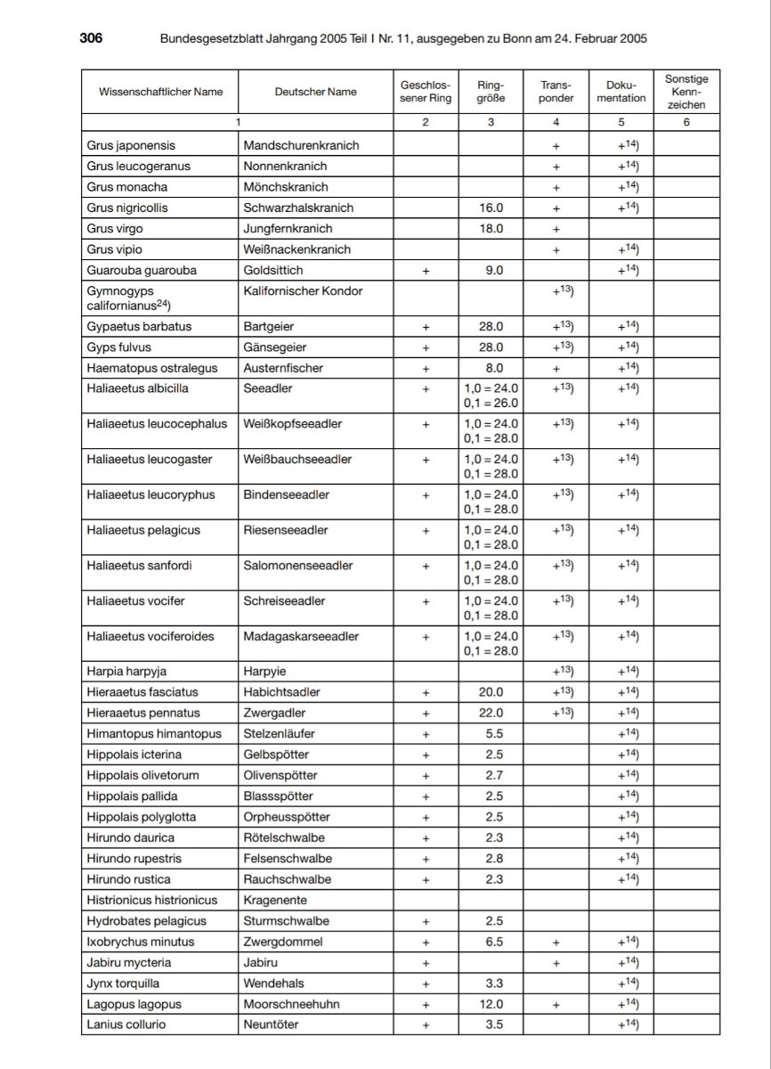 Федеральным предписанием общества по охране природы так же составлен список животных и птиц, не только европейских видов, которые в обязательном порядке должны быть окольцованы этими специальными кольцами или прочипированы.