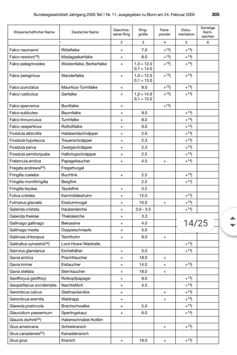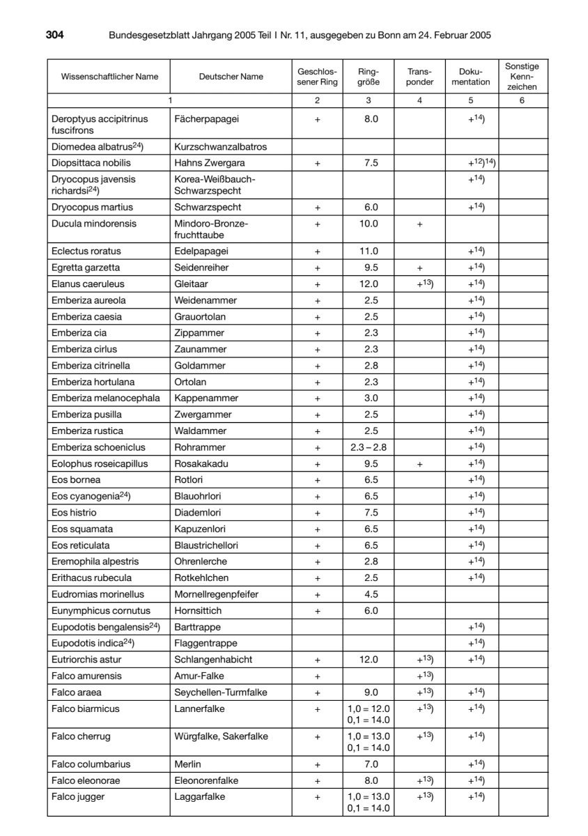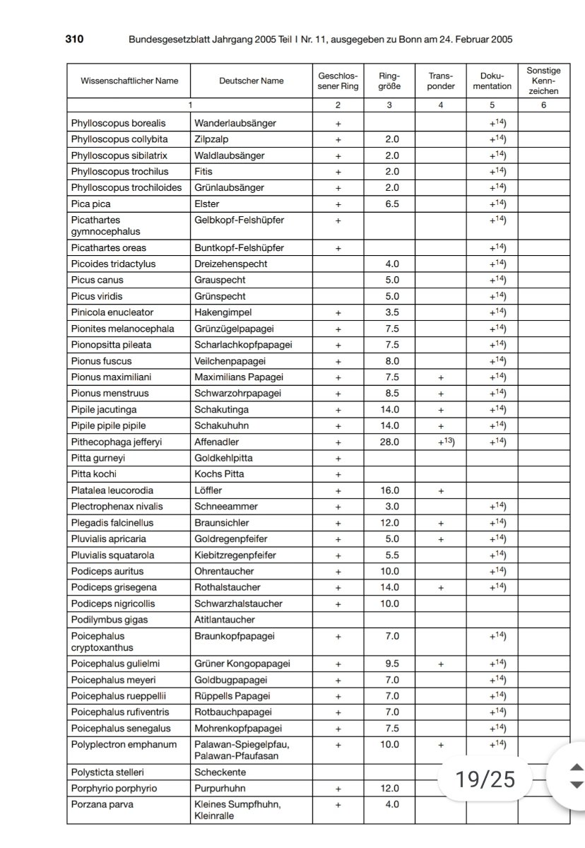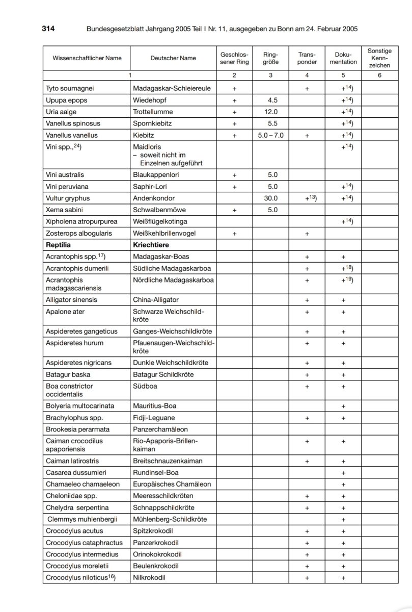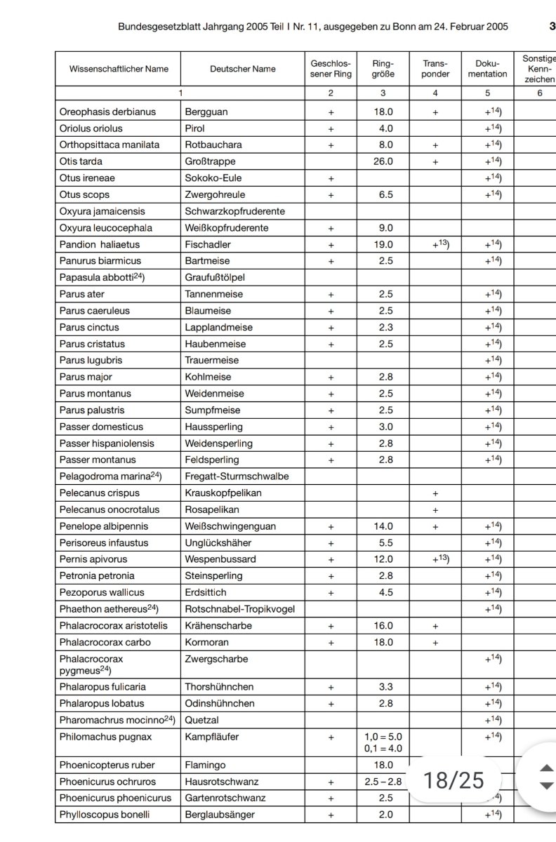 Федеральным предписанием общества по охране природы так же составлен список животных и птиц, не только европейских видов, которые в обязательном порядке должны быть окольцованы этими специальными кольцами или прочипированы.