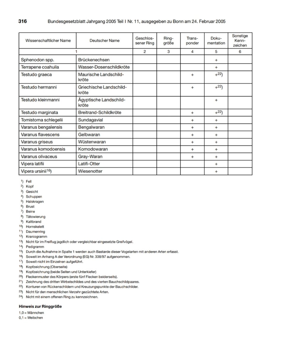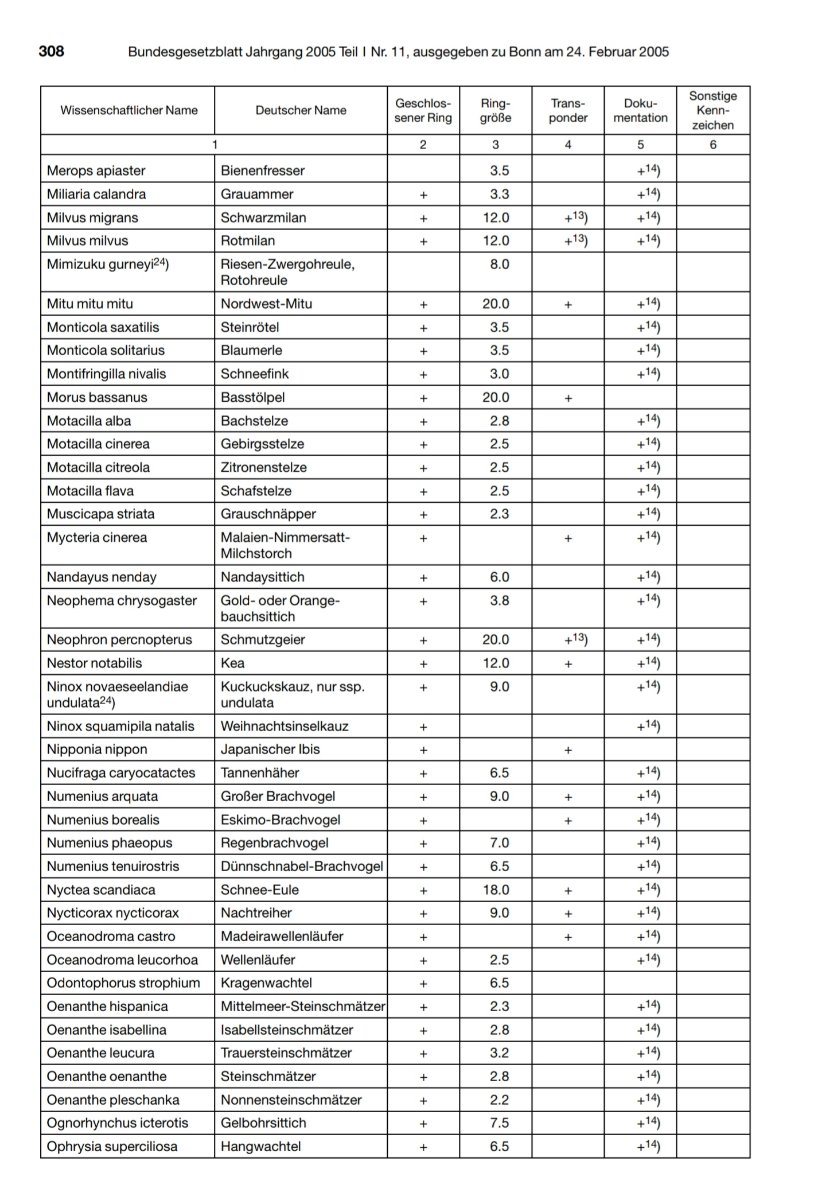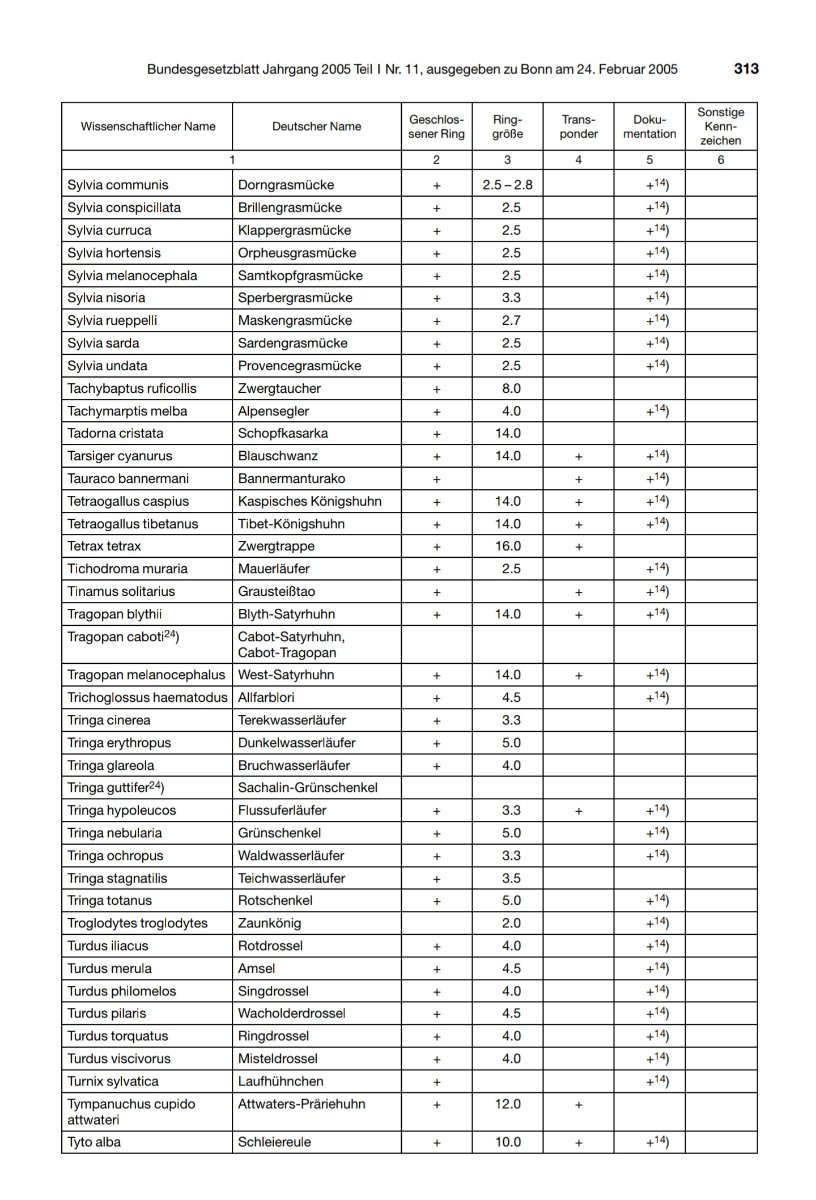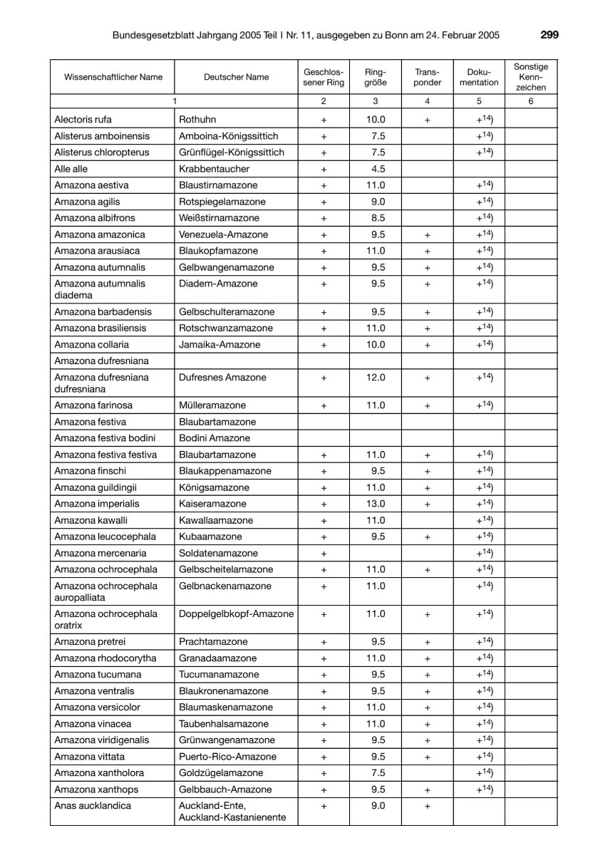 Федеральным предписанием общества по охране природы так же составлен список животных и птиц, не только европейских видов, которые в обязательном порядке должны быть окольцованы этими специальными кольцами или прочипированы.