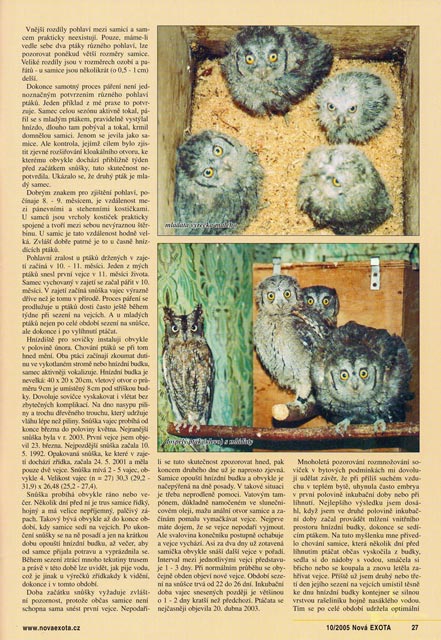 Появившиеся птенцы издают тонкий стрекочущий писк. В этот период конечно же желательно предлагать разнообразных насекомых (личинки и куколки мучного хруща, сверчки, муравьиные куколки). Тем не менее в один из гнездовых сезонов, когда должны были появиться птенцы, я отсутствовал, и совки, а разумеется и появившиеся птенцы, получали кусочки довольно старой и жесткой крысятины (на данное время отсутствовал хороший корм), на которой и взращивались в течение недели с момента появления.