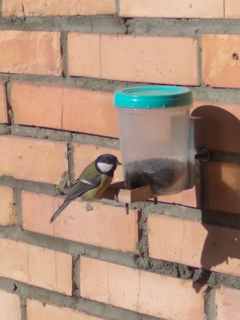 p.s. В банке поставил площадку с наклоном, чтобы все семечки скатывались на площадку, иначе синицы видят их на дне банки и пытаются достать и злятся, что не могут.