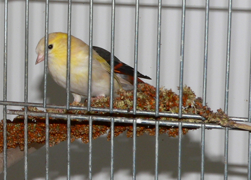 Добавлю к этому упоминание ещё одной мутации, которая получила название чехословацкой. Видимо, о ней идет речь в предыдущем сообщении. Птица выглядит желтой, хотя темные участки оперения не пропадают совсем. Точнее, эумеланин исчезает полностью, но феомеланин в некотором количестве остается, что делает кончики перьев на крыльях и "шапочку" темными.