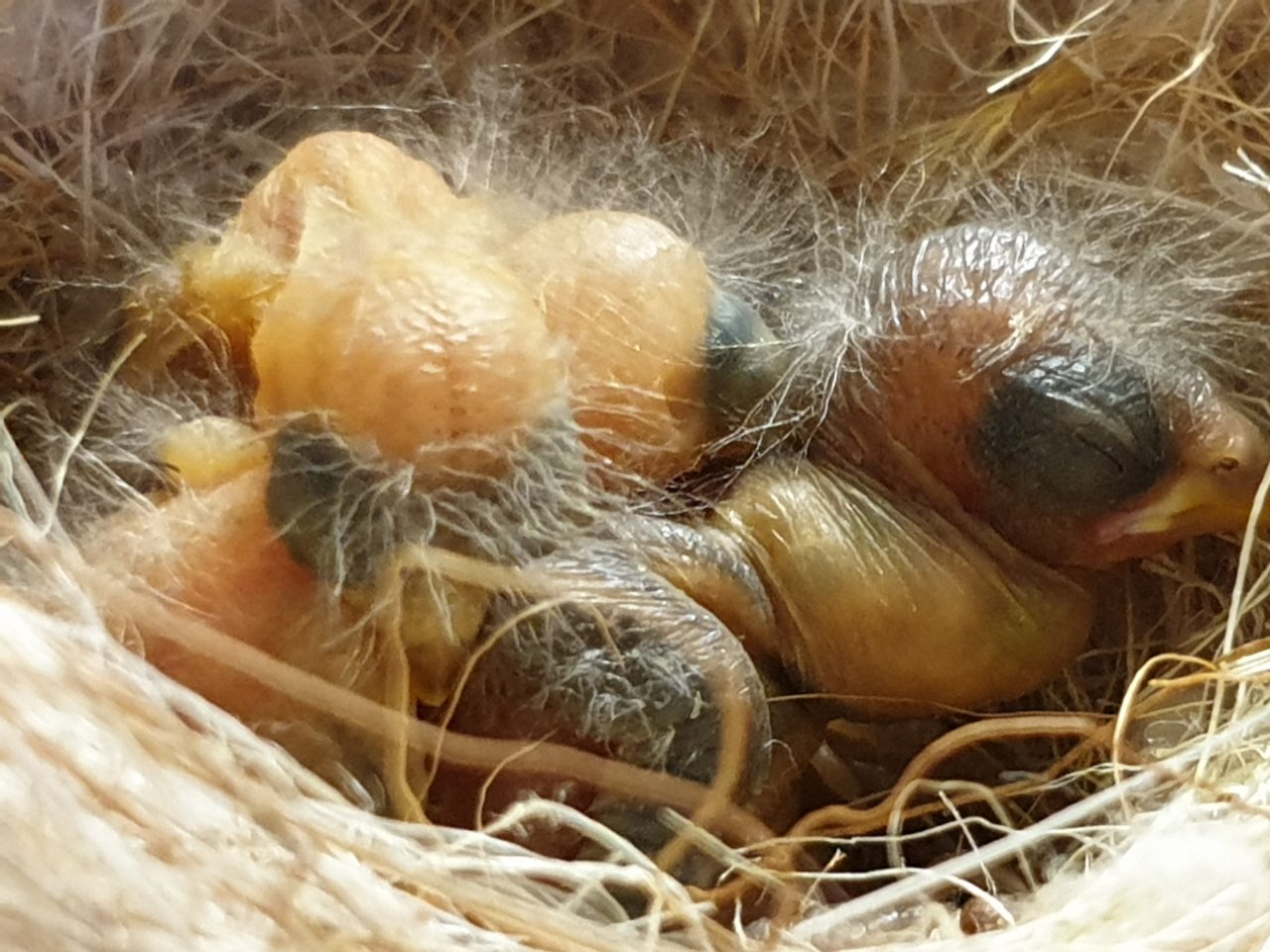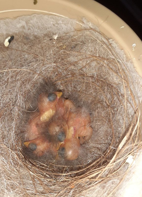 День начался сегодня с печальки. Когда самочка сошла с гнезда на кормление , визуально недосчиталась 1 птенца...пришлось их домик снять и проверить - так и есть