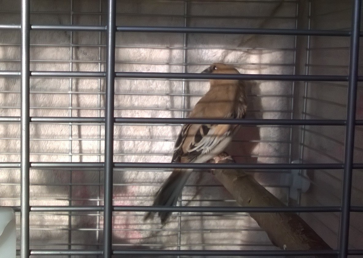 Сейчас самец буланого вьюрка живет с канарейками.Канарейки его научили купаться в купалке.