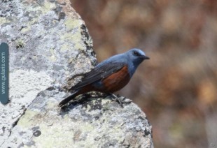 У синих каменных дроздов выражен половой диморфизм и оба пола легко отличить друг от друга. У самцов чёрно-синее оперение (у самца дальневосточной формы брюхо и подхвостье красно-коричневые), а самки серо-чёрные со светлыми пятнами. Имея величину 20 см они несколько меньше обыкновенных скворцов. Отличается довольно пугливым поведением.