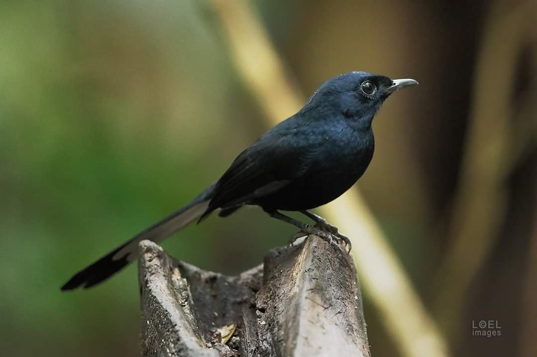 Белобрюхий шама-дрозд, также известен как палаванский шама. Его можно определить по черному цвету с синим глянцем на верхней части тела. Весь черный, за исключением белых кроющих подхвостья и четырех белых перьев на внешнем крае хвоста. Самки более тусклые - черные, с белыми перьями на нижней части живота. Шама имеет размер около 21 см.