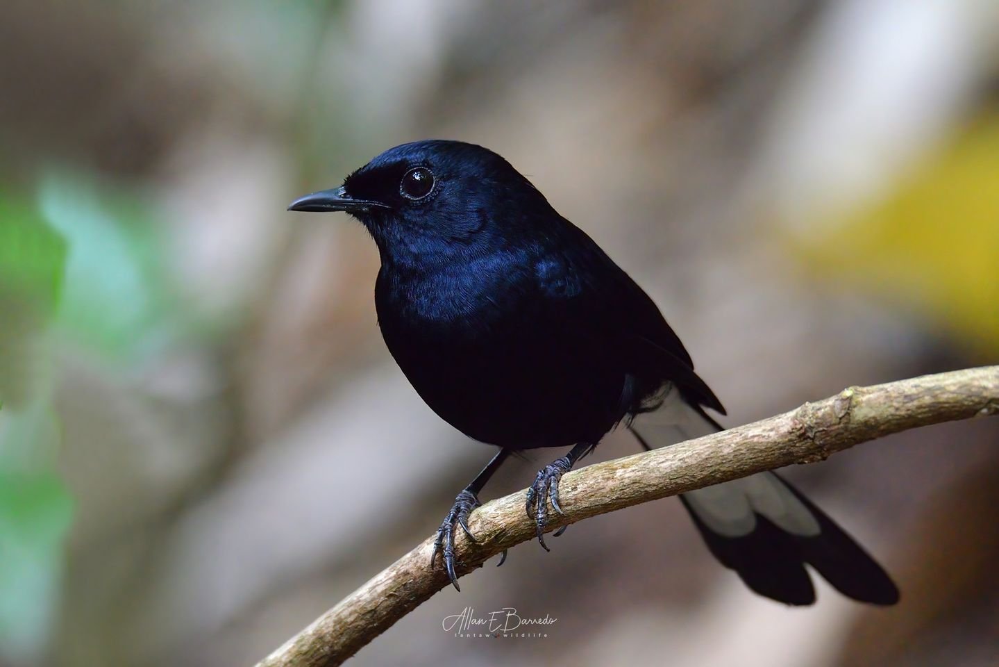 Белобрюхий шама-дрозд, также известен как палаванский шама. Его можно определить по черному цвету с синим глянцем на верхней части тела. Весь черный, за исключением белых кроющих подхвостья и четырех белых перьев на внешнем крае хвоста. Самки более тусклые - черные, с белыми перьями на нижней части живота. Шама имеет размер около 21 см.