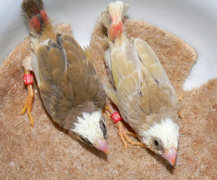 Папашка погиб у заводчицы, когда птенцы были еще совсем крохи и ей пришлось подложить под японцев. В итоге пестрый самец оказался слишком ориентирован на птичек с коричневым оперением и совсем не реагирует на самок своего вида, зато его мама в паре с обычным красномасквым самцом дала трех пестрых тростничков из 5 птенцов. К сожалению, один погиб в полуторамесячном возрасте после пересадки в вольер..