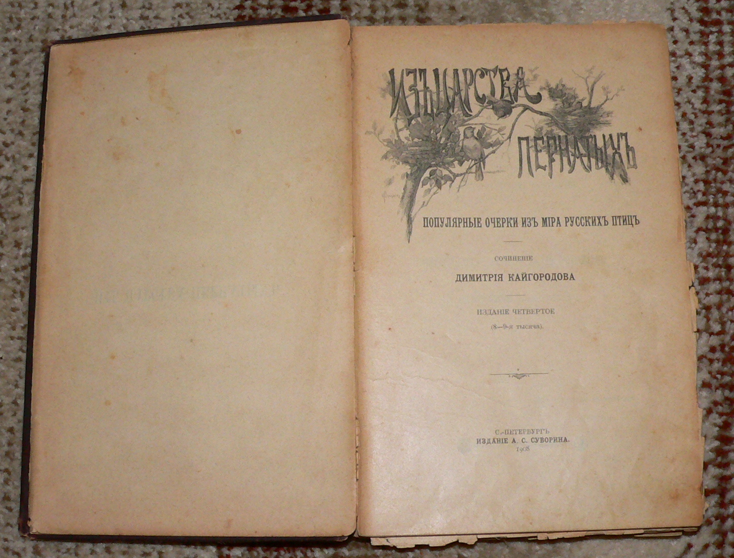 Из старых раритетных изданий -книга выдающегося русского орнитолога Дмитрия Кайгородова, издания 1908 года :!: , с черно-белыми рисунками и цветными иллюстрациями, фабрично бережно переложенными пергаментной бумагой. Обратите внимание, кому посвящена книга :) .