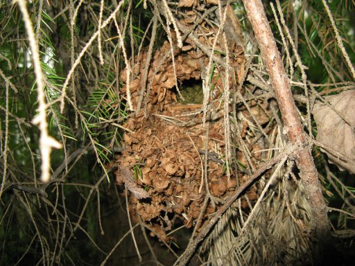 Вход в гнездо сбоку в верхней части гнезда.Мне кажется,что на фото это видно.По сути-гнездо крапивника на ветке напоминает гнездо ремеза,руковичку,только "большой палец" практически отсутствует,и само гнездо менее аккуратное свиду,более бочонкообразное.