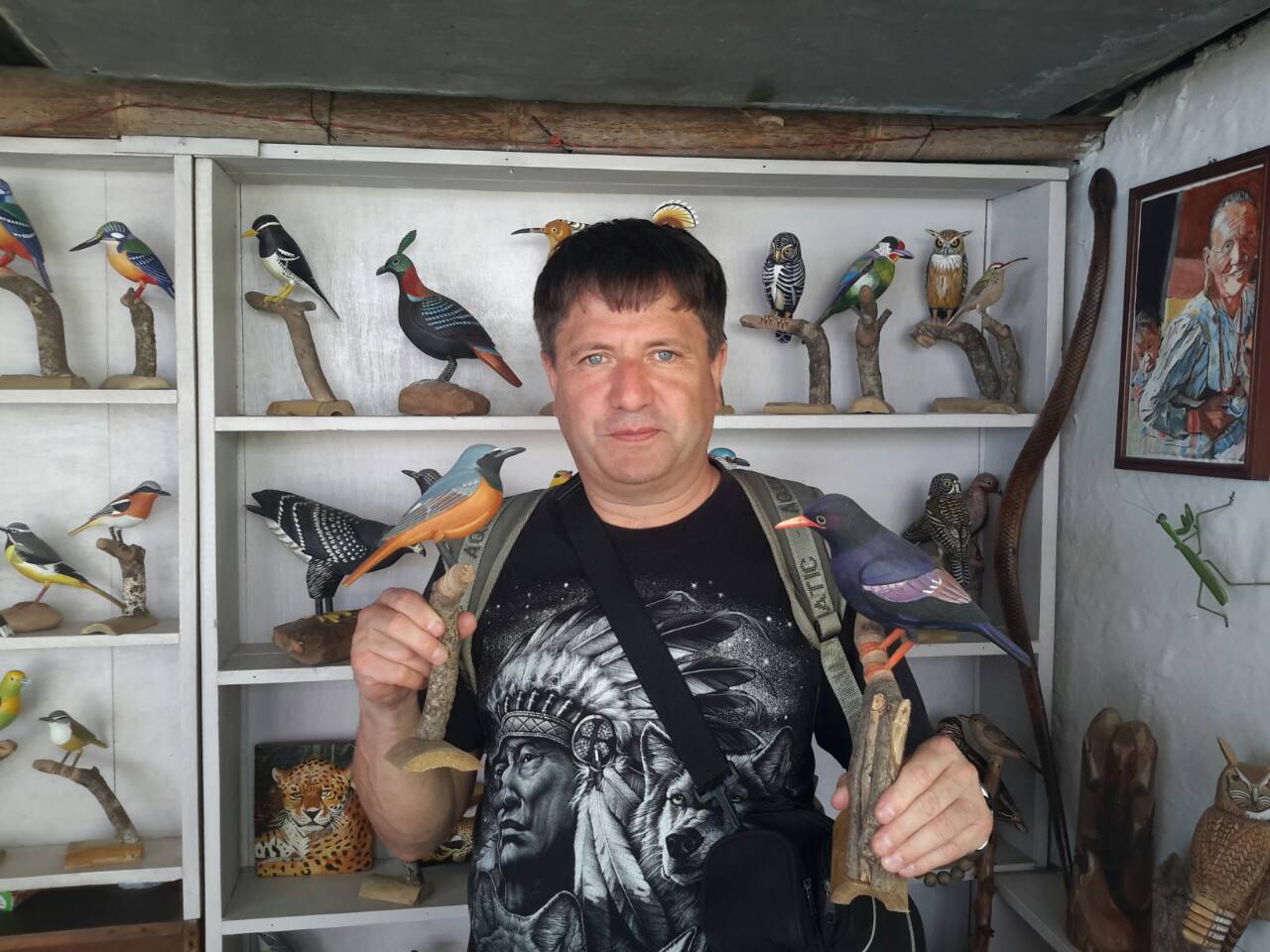 Далеко от столицы, в одной маленькой лавчонке , мы случайно встретили художника, на стенах у которого кроме картин стояло на полках много фигурок различных птиц, вырезанных из дерева. В большинстве своем они были сделаны в точную натуральную величину. Окрас птиц полностью соответствовал действительности. Каждую фигурку оживляли глаза...не знаю из какого материала они выполнены, но создавалась иллюзия живой птицы.Чувствовалось что мастер в теме и делает все с большой любовью и знанием. В разговоре выяснилось, что кроме своих наблюдений он так же использует цветные фотографии и описания из англо-язычной литературы.
