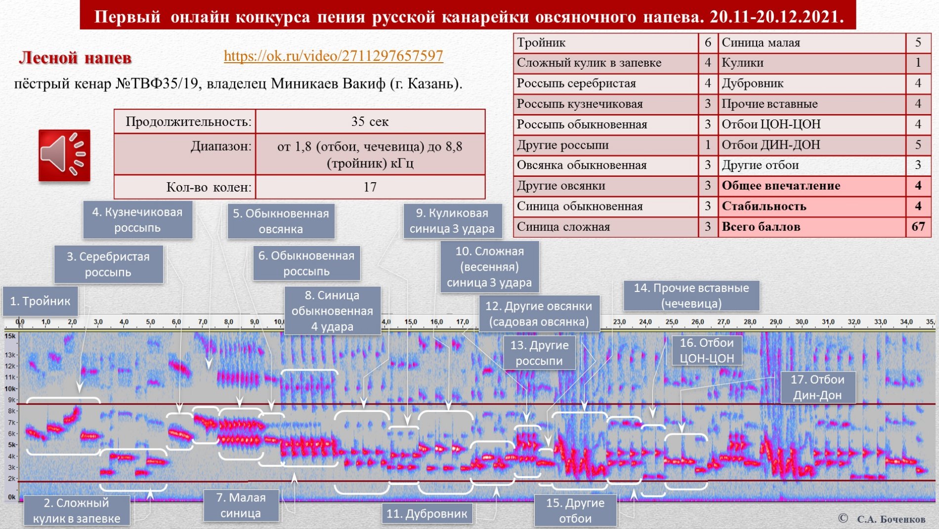 Я сделал разбор по одному самому полному проходу каждой из четырёх птиц набравших максимальные баллы в своей номинации чтобы наглядно на сонограмме показать те колена, которые коллегия судей оценила в протоколе. Две птицы для примера - на картинках. Можно скачать эту презентацию с Яндексдиска тут: https://disk.yandex.ru/i/jjxU1deWlW0nLA