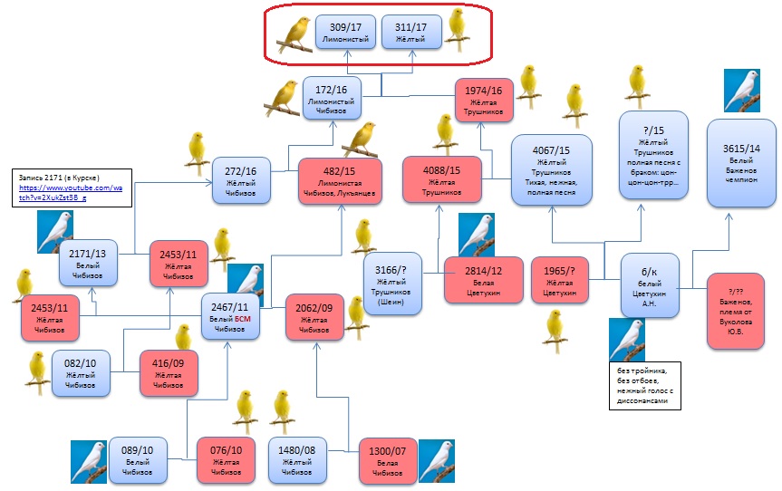 я нарисовал сам по данным этой родословной. Стало очень интересно собрать максимально полную картину. В интернете поискал ещё инфу о птичках-предках по номерам колец. Многого найти не удалось, но кое-что...