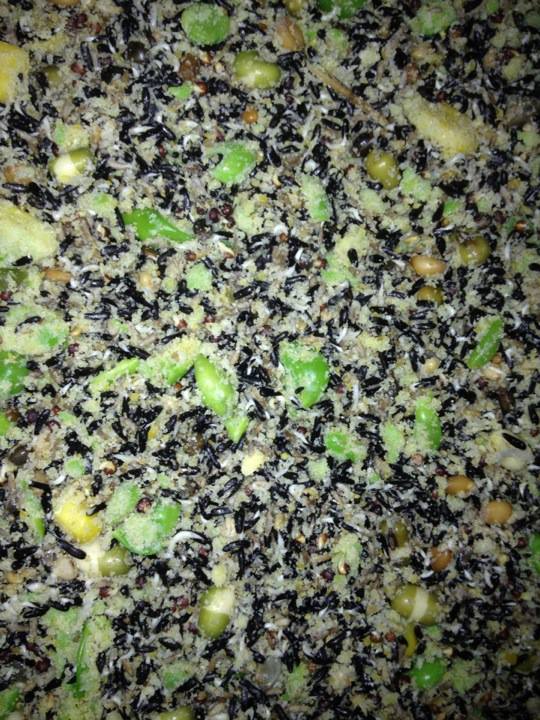 Размер терки выбирается под основного едока. Представленная на фото смесь, служит дополнением к рациону у моих зерноядных птиц, а также в периоды выкармливания птенцов. В зависимости от сезона, состав несколько меняется, путем добавления тех или иных составляющих.