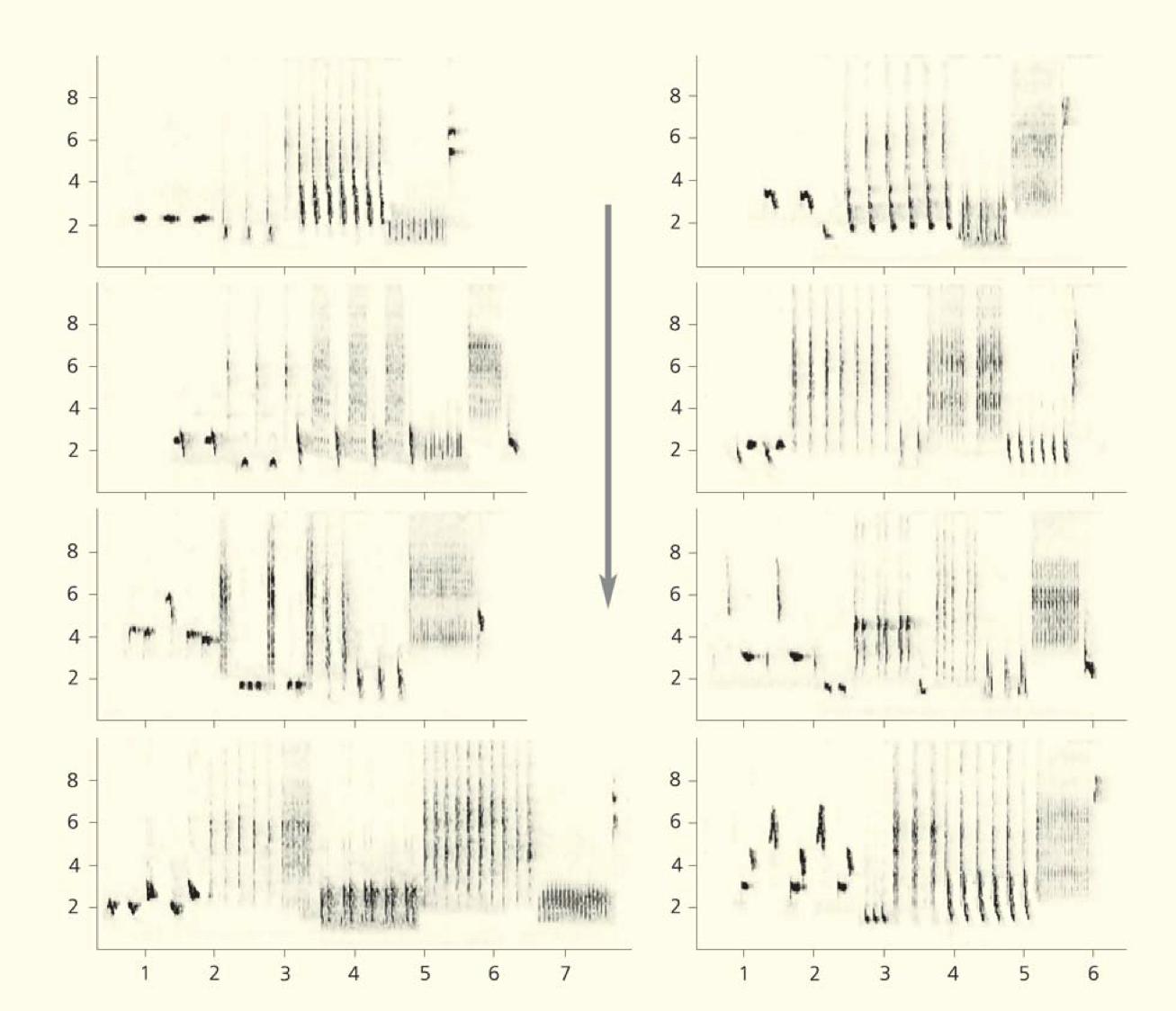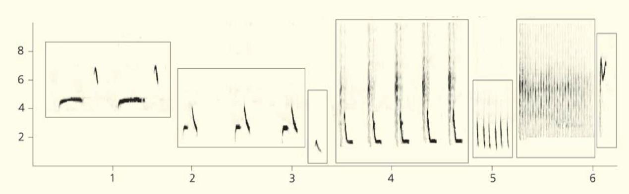 Рис 1. Популярные типы песен московских соловьёв и две стереотипные программы их исполнения (А и Б). Стрелка показывает последовательность исполнения. Цифры по оси ординат — частоты (кГц), по оси абсцисс — отсчёт времени (с).