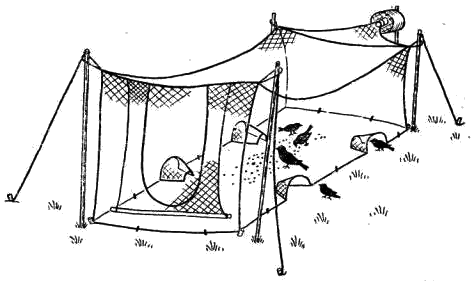 Конусные ловушки на куликов имеют направляющие стенки<br />(по: P. Hollom and H. Brownlow, 1955)