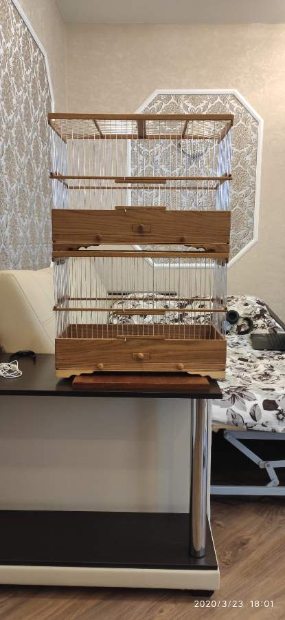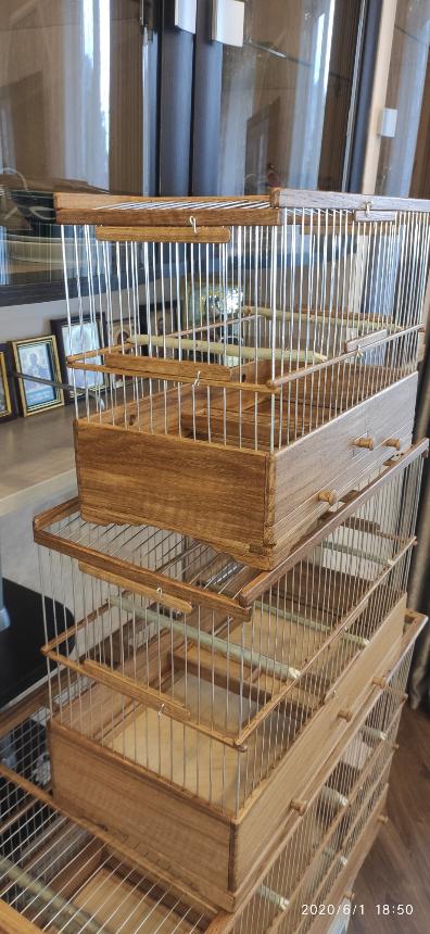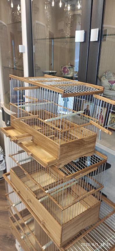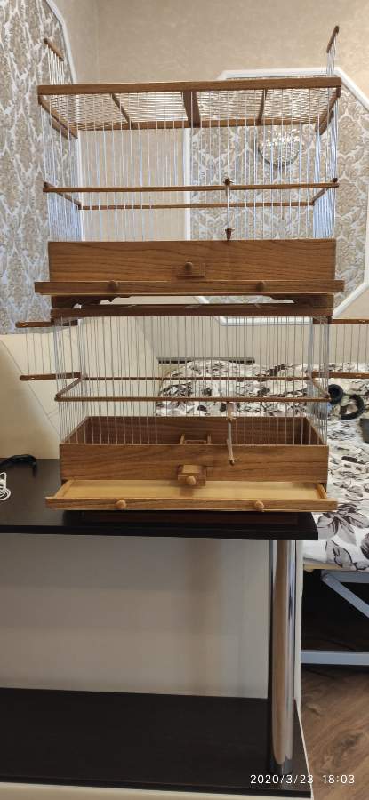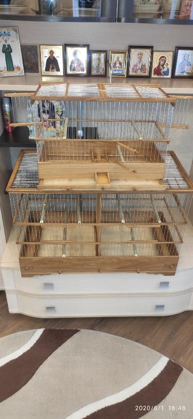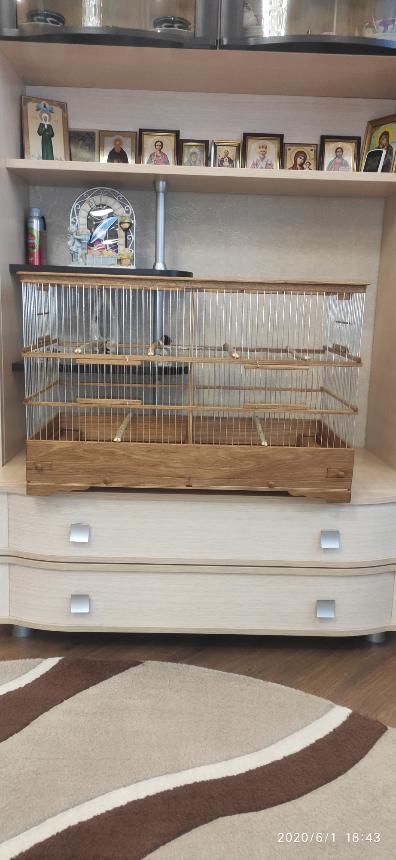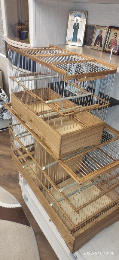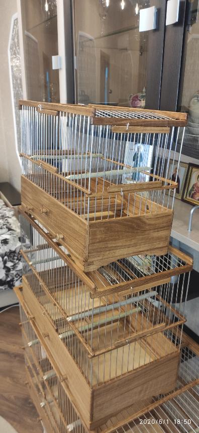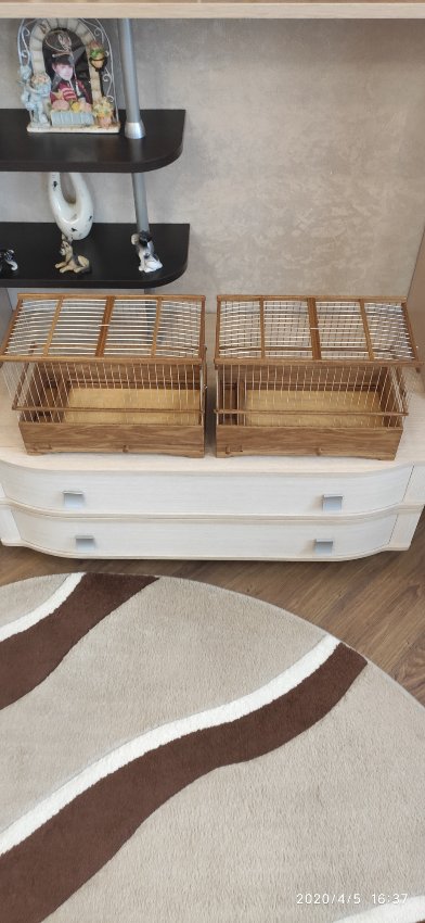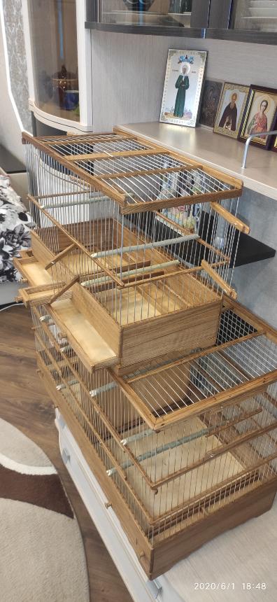 Добрый вечер всем кому интересны клетки моего изготовления.Вот представляю вам на обзор ещё пару клеток сделанных мною для города Абакан и Муром.Клетки классические и стандартного размера.500×240×350мм .Дерево дуб,спицы пищевая дюраль диаметр 1,6мм,фанера влагостойкая 4мм.Клетки пропитаны Пинотексом и как всегда покрыты в два слоя импортным яхтным лаком с промежуточным шкурением между слоями лака.На одной клетки ножки и ручки липа и распошные боковые дверцы.На другой ножки и ручки под цвет клетки тоже дубовые и боковые дверцы подъёмные.Кормушки выдвижные по центру клетки.При таком расположении кормушки не съедается полезное пространство в клетки и расстояние между жердочками увеличивается по сравнению если бы кормушка была расположена с лева или с права.Да и птица не будет гадить в кормушку.