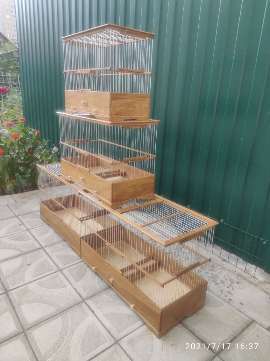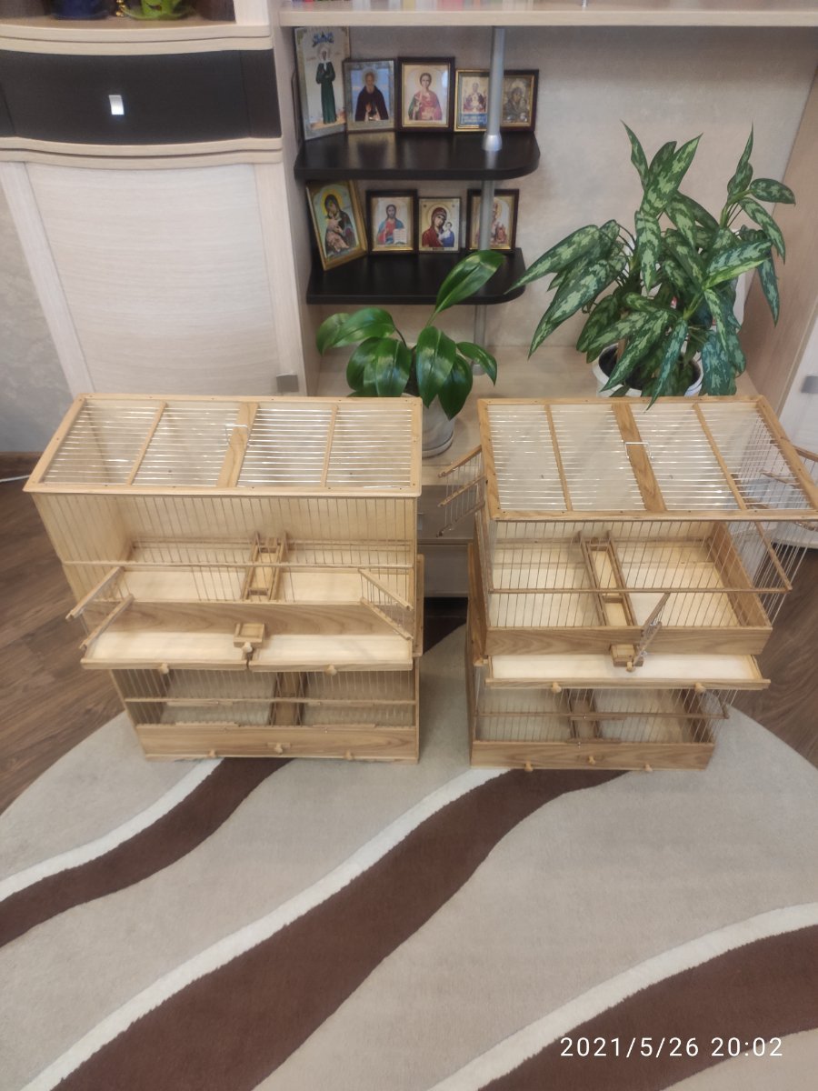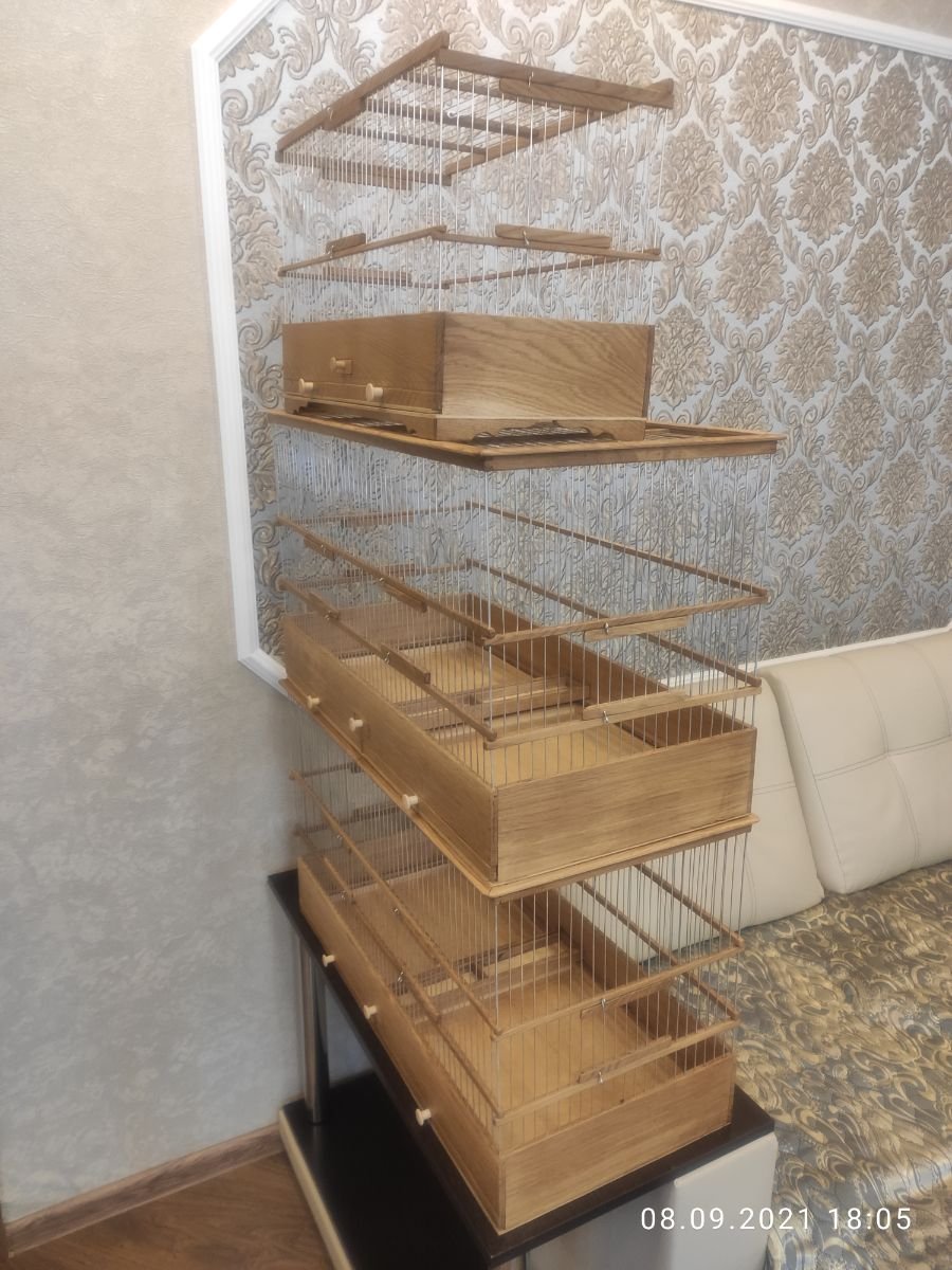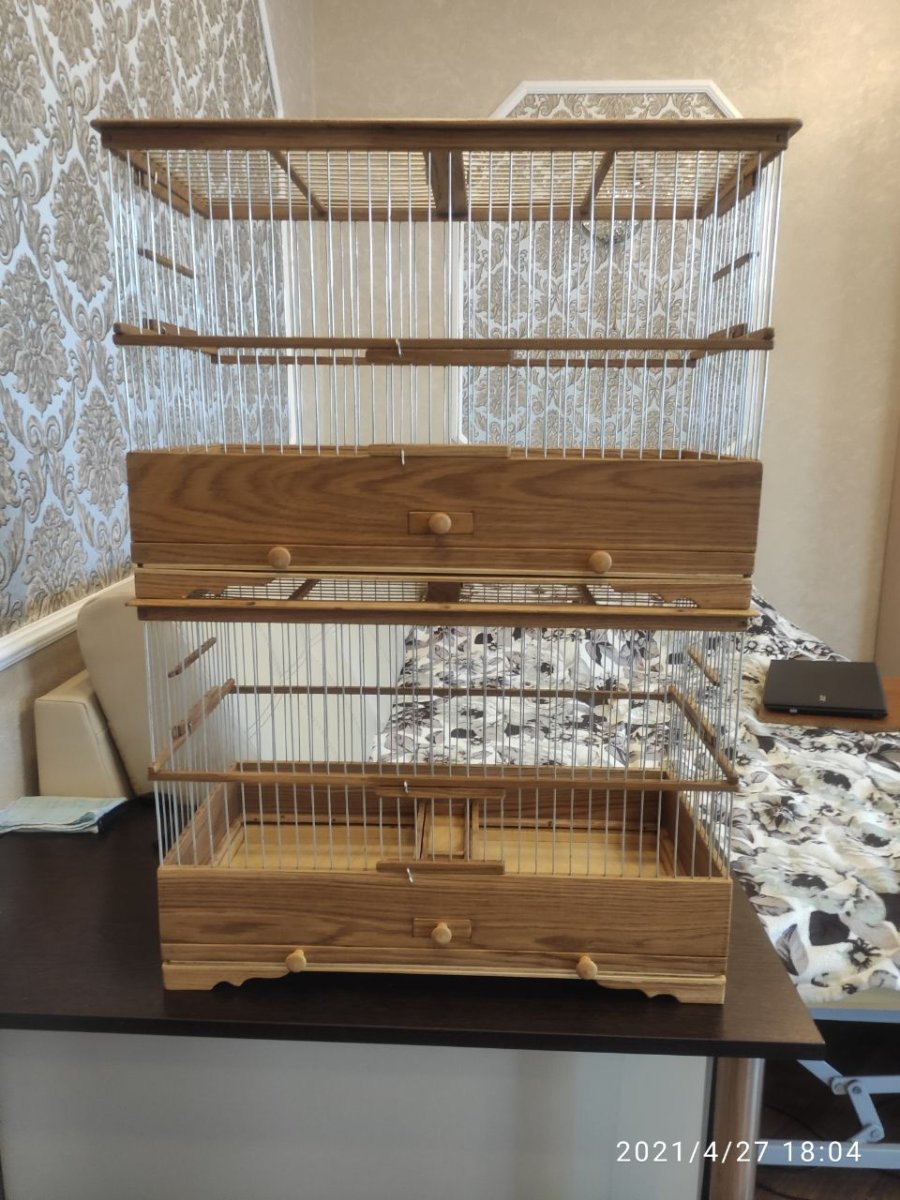 Здравствуйте уважаемые форумчане!Выкладываю на общее обозрение и обсуждение четыре клетки все клетки сделаны в разные города России.Клетки все сделаны из дуба,спицы диаметром 1,6мм пищевая дюраль Фанера влагостойкая 4мм.Клетки все пропитаны пинотексом и покрыты в два слоя лаком для яхт.Размер клеток две 600×270×380мм одна без выдвижного дна и кормушки по желанию заказчика ,а также верх клетки классический.Две верхние одна размер 500×240×340мм верх прямой с карнизом.Самая верхняя клетка размер 400×210×260мм.Кормушки в клетках по центру и дно выдвигается вперёд!Критика принимается,но в меру!К замечания прислушиваюсь!Хотя клетки делаю давно.Но как говорится век живи и век учись!Спасибо всем кто следит за моими работами!Удачи и здоровья всем!