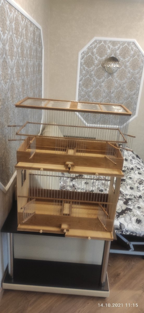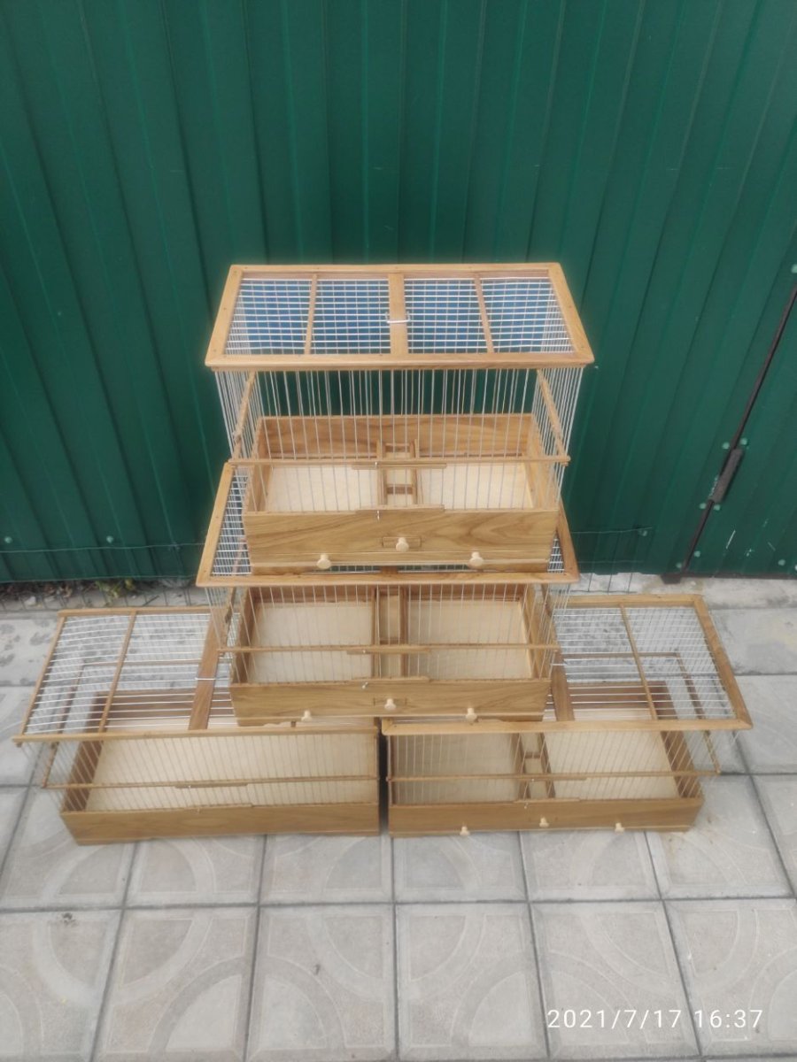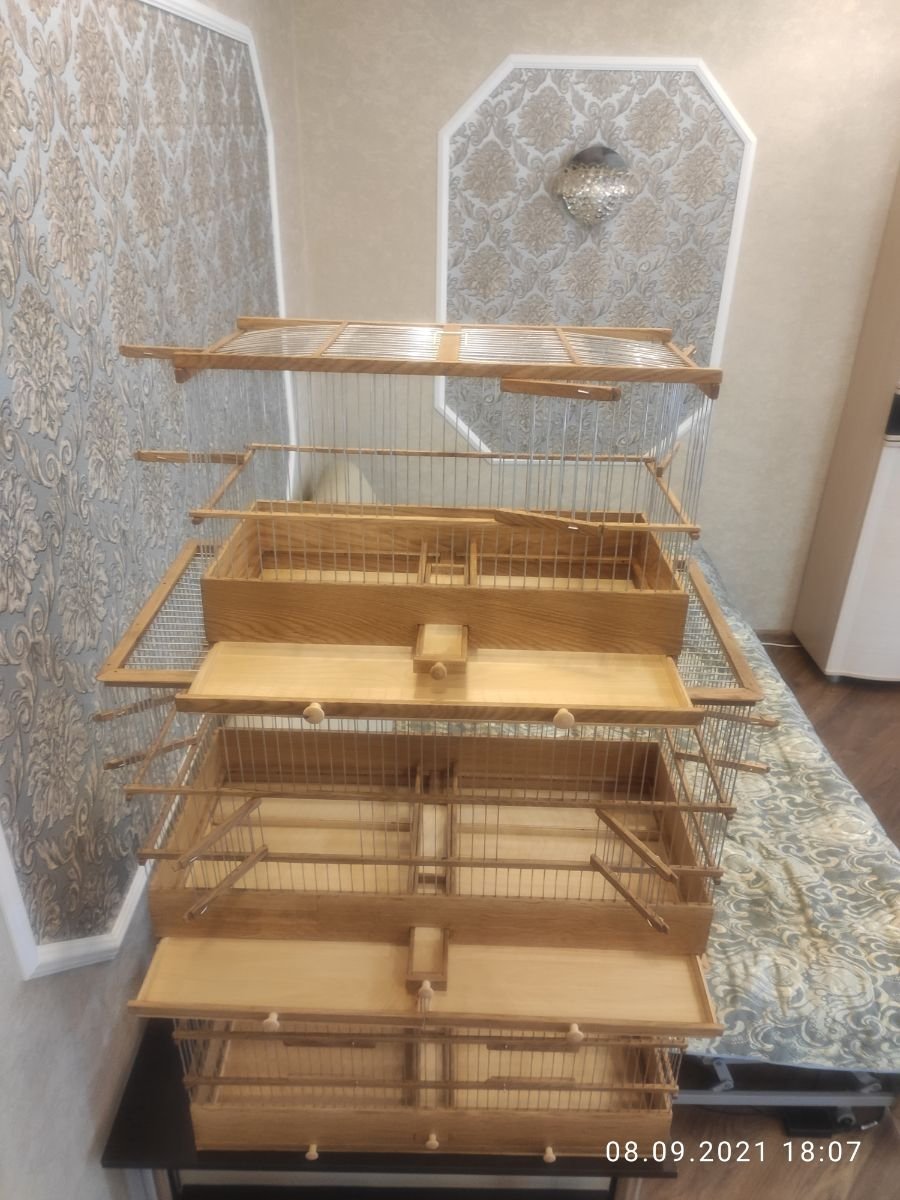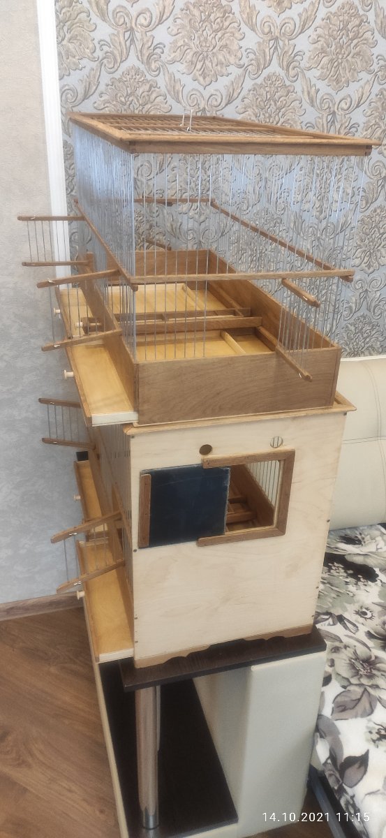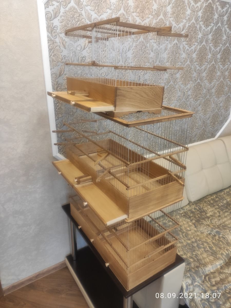 Здравствуйте уважаемые форумчане!Выкладываю на общее обозрение и обсуждение четыре клетки все клетки сделаны в разные города России.Клетки все сделаны из дуба,спицы диаметром 1,6мм пищевая дюраль Фанера влагостойкая 4мм.Клетки все пропитаны пинотексом и покрыты в два слоя лаком для яхт.Размер клеток две 600×270×380мм одна без выдвижного дна и кормушки по желанию заказчика ,а также верх клетки классический.Две верхние одна размер 500×240×340мм верх прямой с карнизом.Самая верхняя клетка размер 400×210×260мм.Кормушки в клетках по центру и дно выдвигается вперёд!Критика принимается,но в меру!К замечания прислушиваюсь!Хотя клетки делаю давно.Но как говорится век живи и век учись!Спасибо всем кто следит за моими работами!Удачи и здоровья всем!