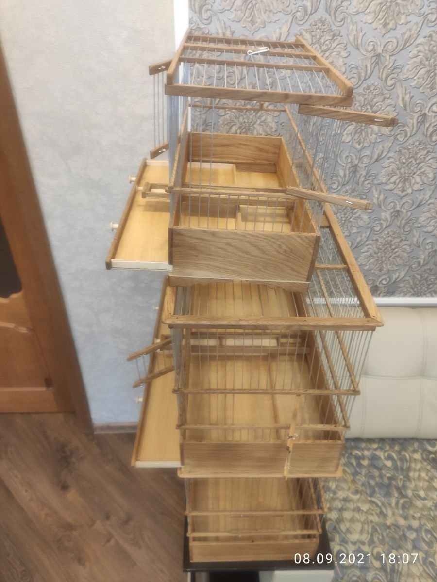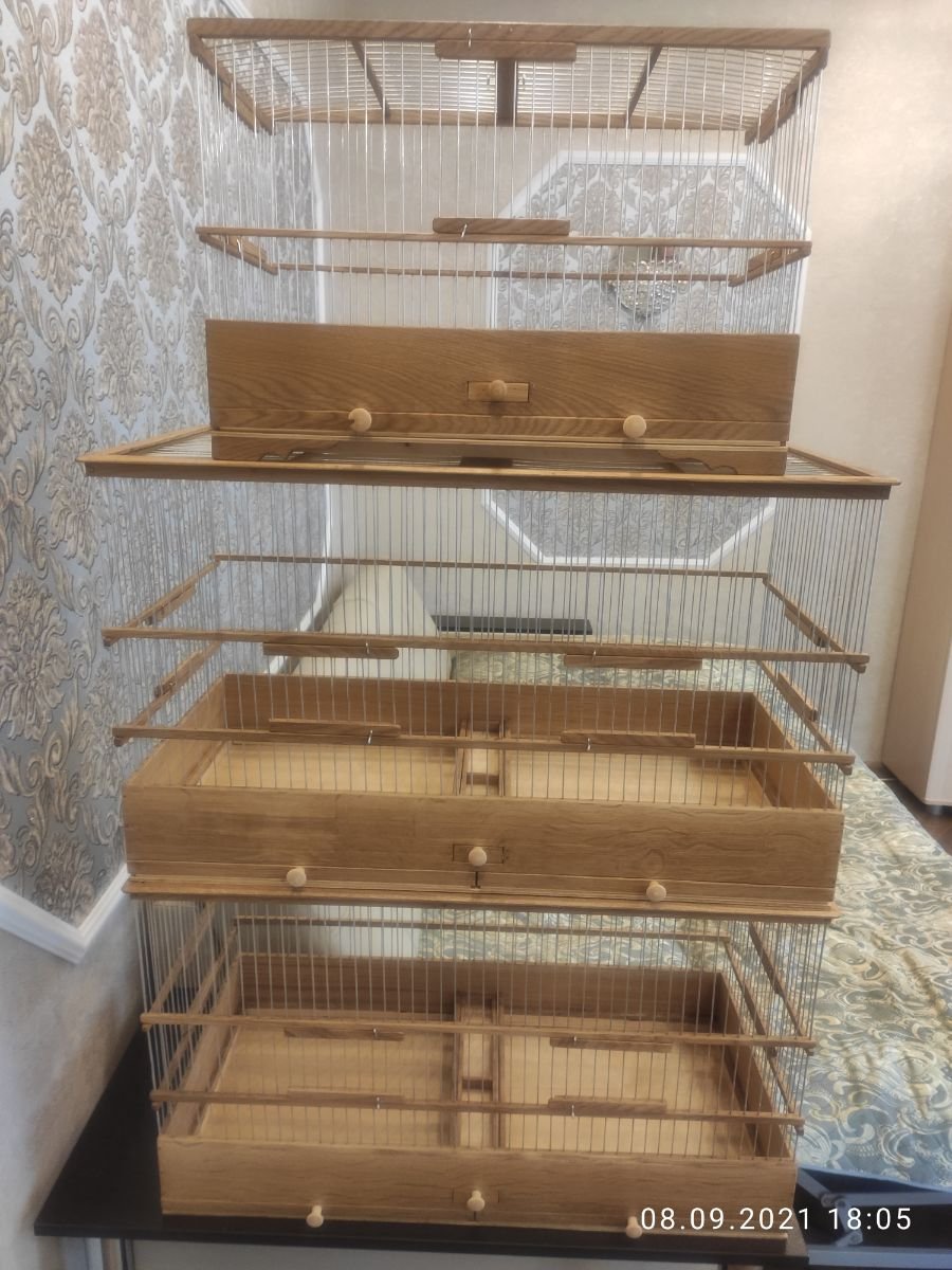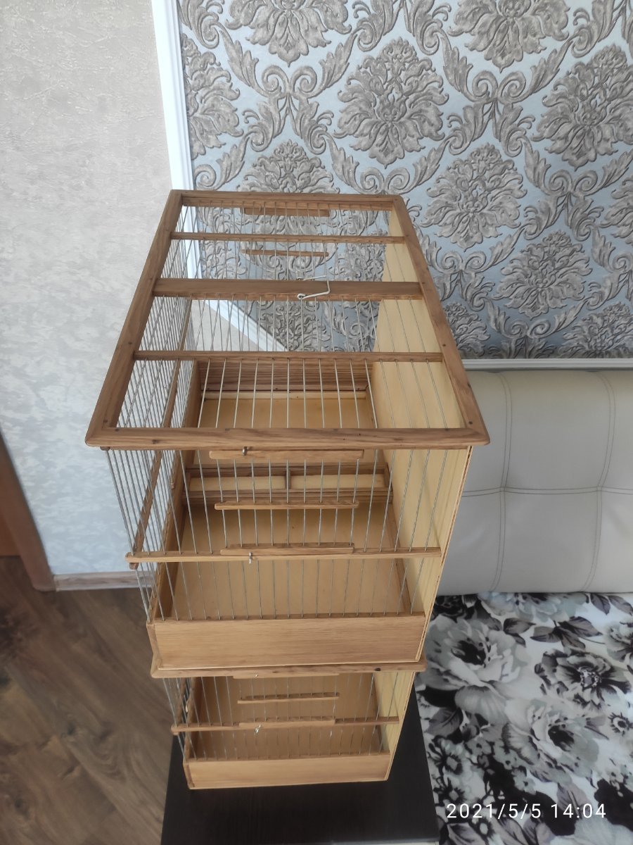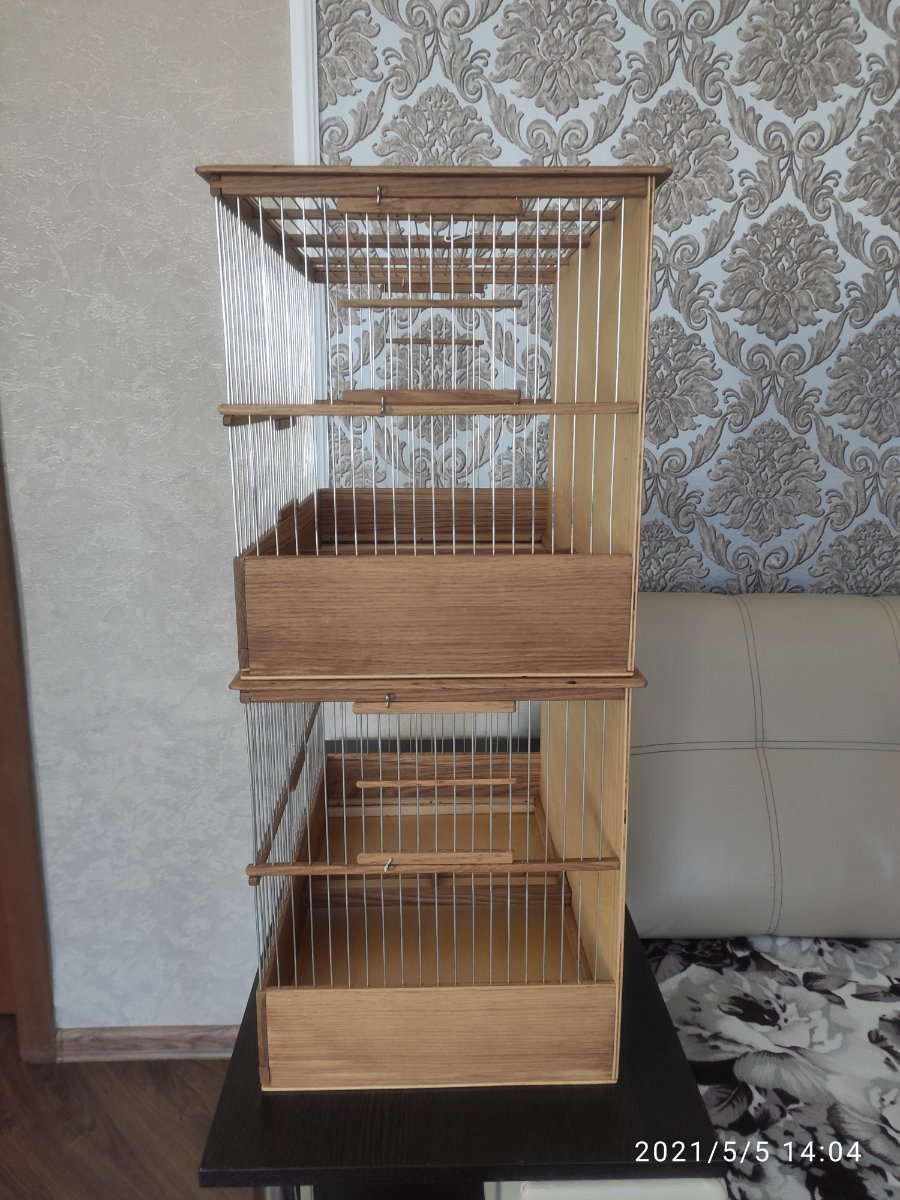 Размер 700×360×400мм дерево дуб, фанера влагостойкая. Спицы пищевая дюраль диаметр 1,6мм, расстояние между спиц по центрам 14мм. Клетка имеет 4 двери, две с боков и две с фронта в нижнем ярусе. Кормушка тоже по центру и два дна выдвижных. Клетки с прямым верхом и карнизом. На клетке для дрозда верх глухой фанера 4мм.