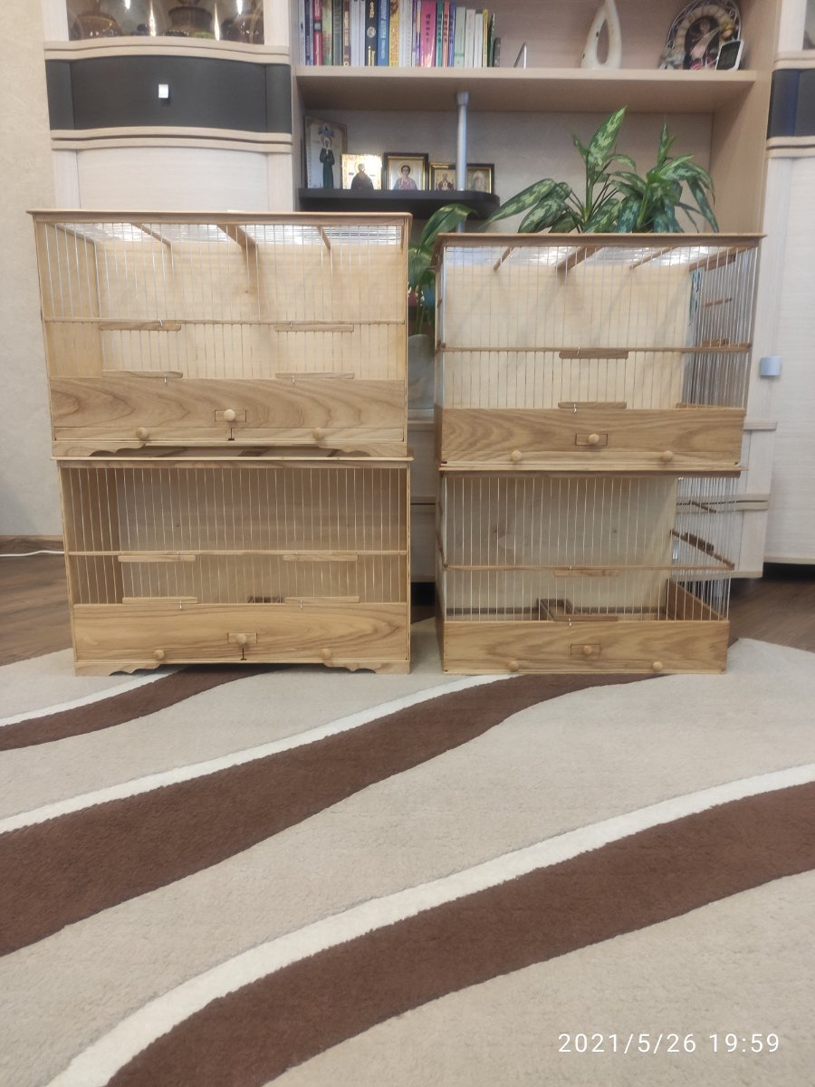 Две одинакового размера 700×330×420мм. Дерево дуб, спицы пищевая дюраль диаметром 1,6мм. Фанера влагостойкая 4мм толщина. Расстояние между спиц по центрам 15мм. Двери распашные 4 шт. Для удобства уборки при таком размере. Поддона тоже два так легче выдвигать! Кормушка по центру. Верх клетки прямой с карнизом.
