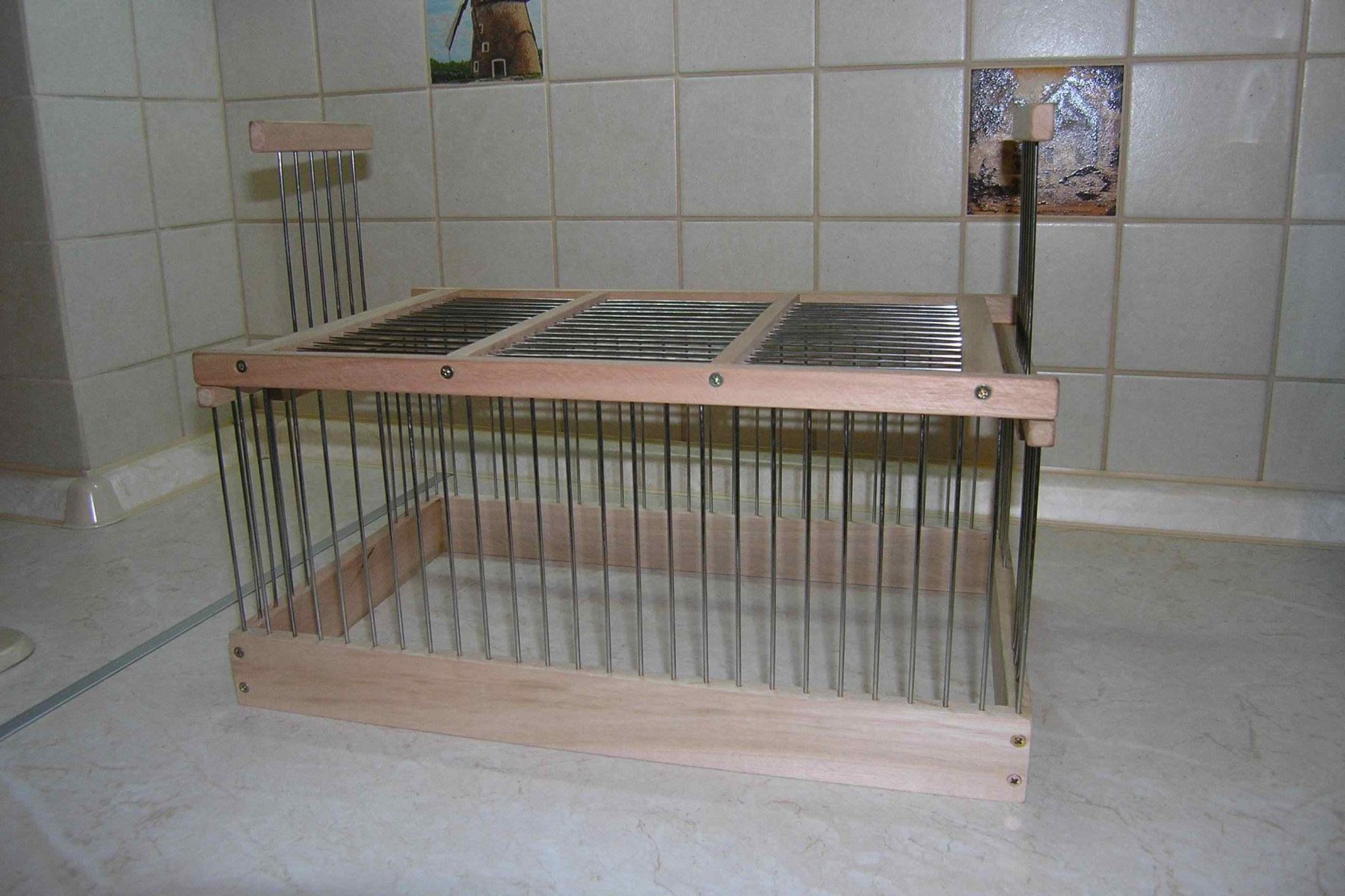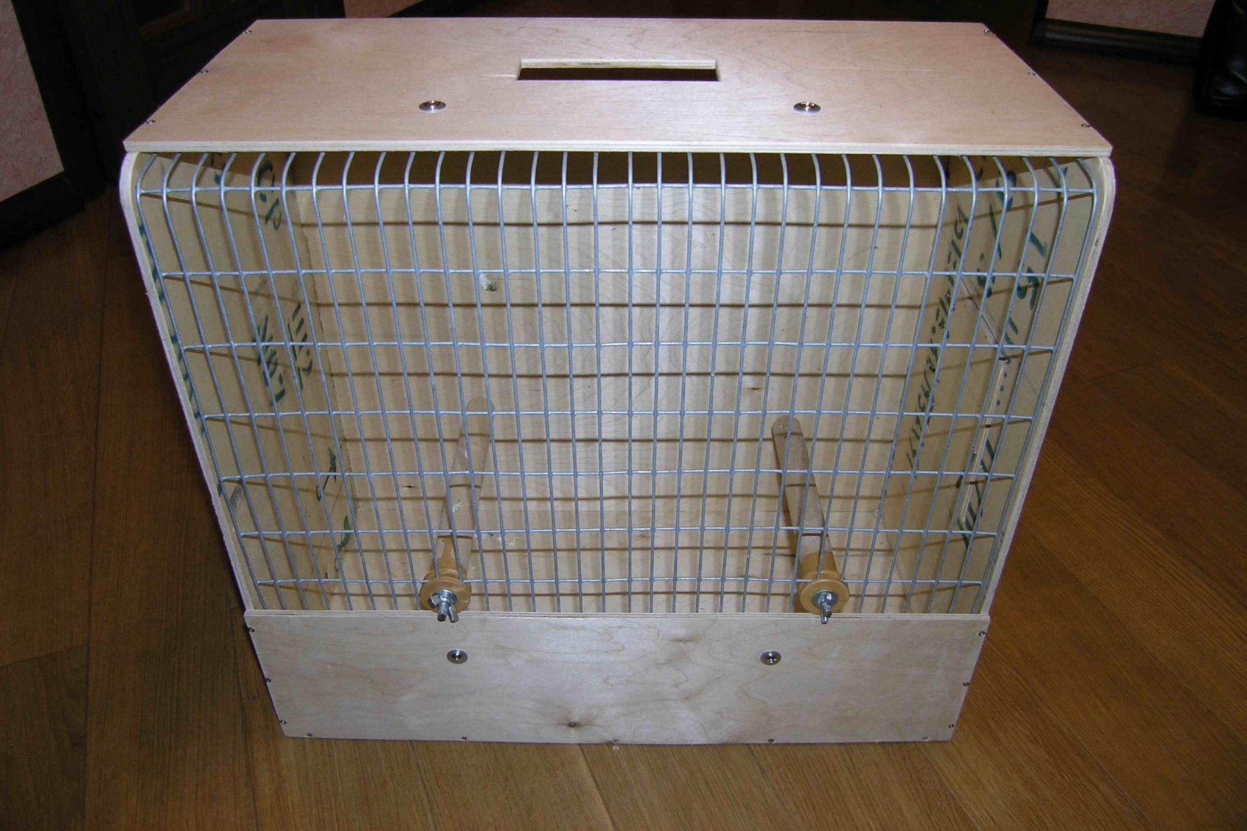 Собственноручная подделка под выставочные клетки на различных зарубежных выставках. Это не окончательный вид клетки. Окончательно их оформил "черный низ - белый верх", т.е. внутри выкрасил парой слоев обычной масляной белой краской, а снаружи покрыл морилкой и парой слоев лака. Вариант на фото больший, под травяных чуть меньшего размера. А вот точный размер не помню.