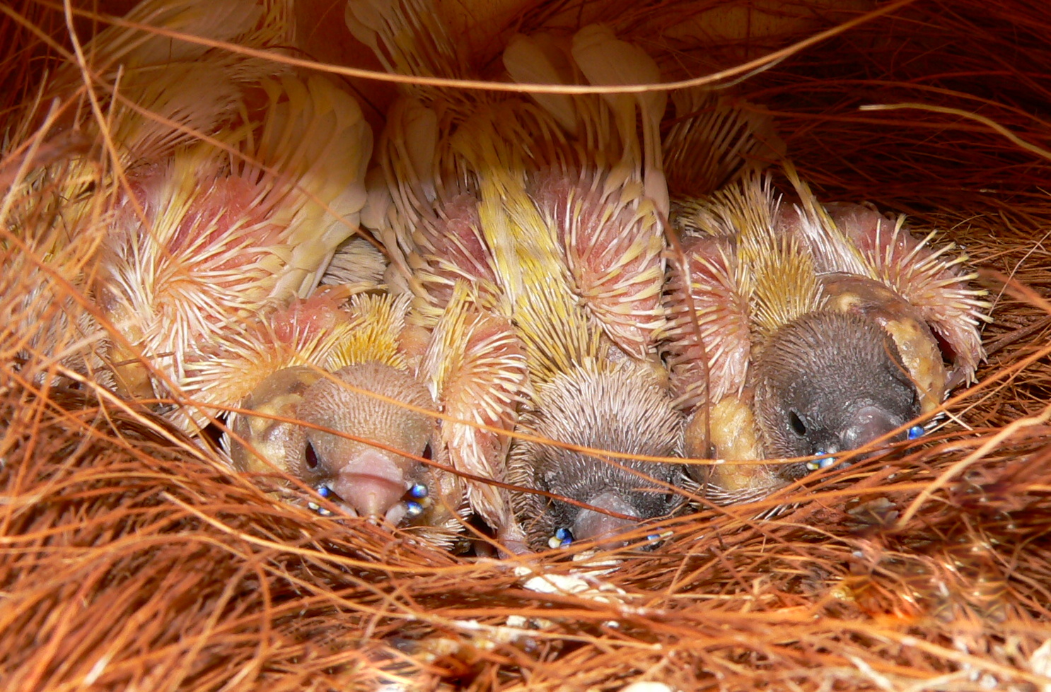 А это птенцы от покупной самочки лютино...но, к сожалению, все закончилось печально... родительские инстинкты никакие... в первой кладке малыши вообще не кормились...во второй - вроде бы уже потихоньку начали кормить, но в гнезде на ночь так и не оставались, малышей не грели ...