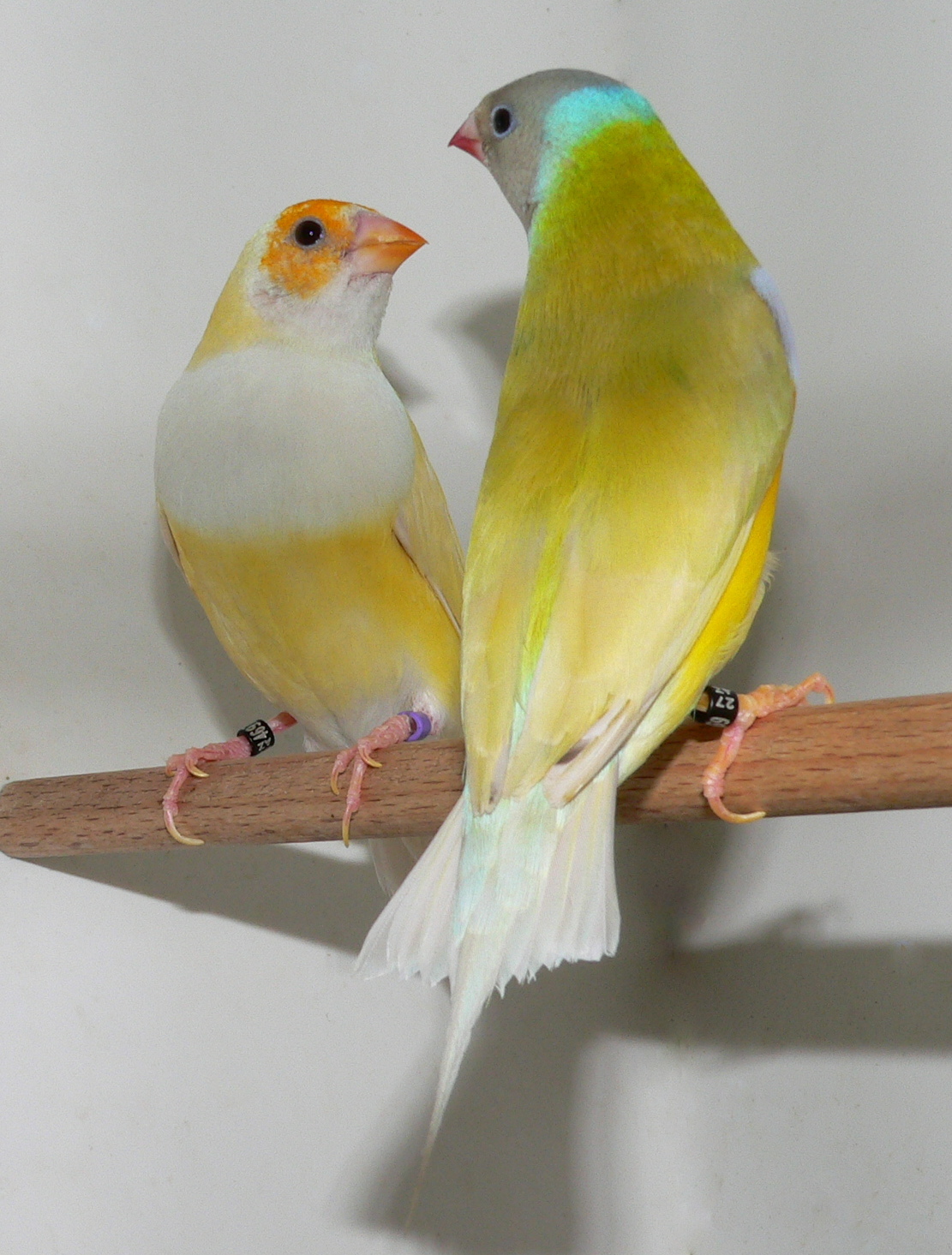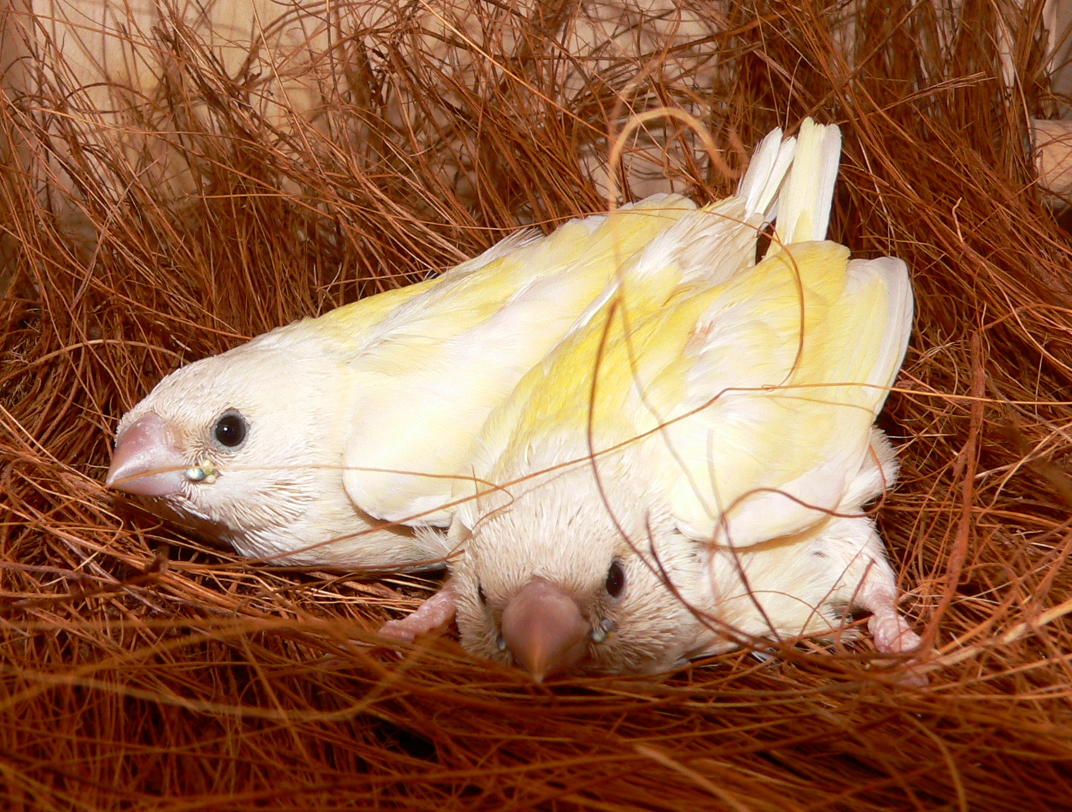 Cамец получен от зеленого белогрудого оранжеголового , щепного на синего самца и от серебристой белогрудой черноголовой самочки ( другими словами - чисто белой). Судя по оперению птенцов - будут они однозначно желтыми...а вот какими желтыми :? - разброс по генетике у них там большой, посмотрим чуть попозже. Сегодня малявки вылетели из гнезда, один из них покрупнее и поголовастее - наверняка самчик, другой и окраской побледнее и помельче ,и форма головы иная, думаю будет самочкой ))). Ну, а там - "Who is who