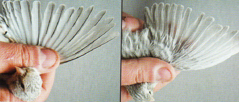 Для сравнения перья груди(сверху),спины(в середине), <br />вокруг клоаки(внизу); в левом ряду - у липохромной <br />шиммель, в правом - у  Urucum шиммель.