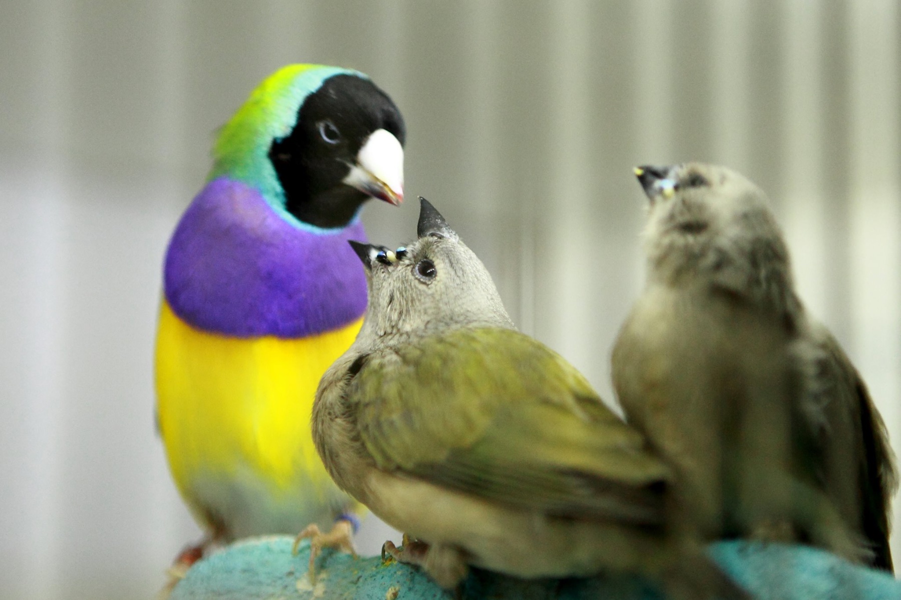 самка серебристая черноголовая фиогрудая, она есть чуть выше на фото, самец желтый фиолетовогрудый , оранжевоголовый.