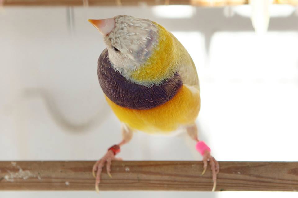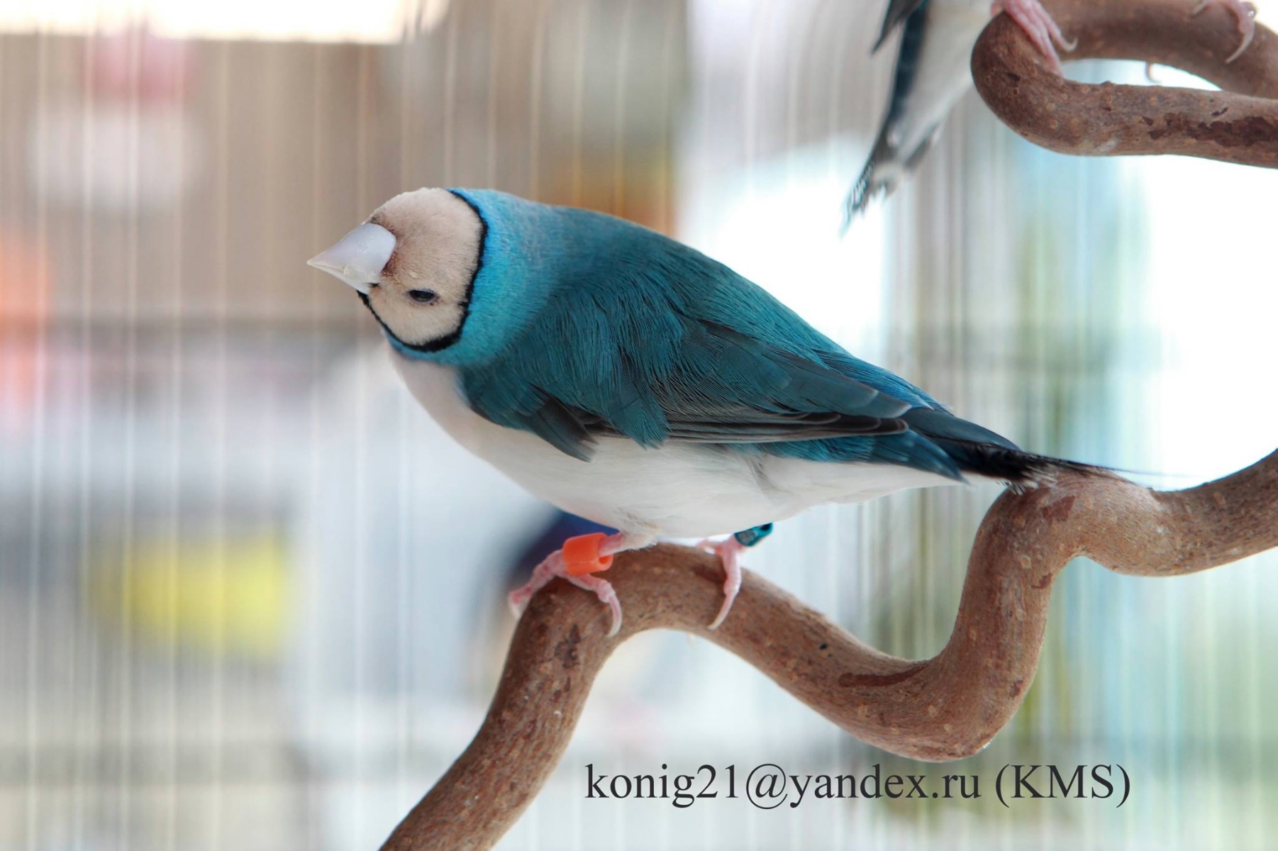 самка серебристая черноголовая фиогрудая, она есть чуть выше на фото, самец желтый фиолетовогрудый , оранжевоголовый.