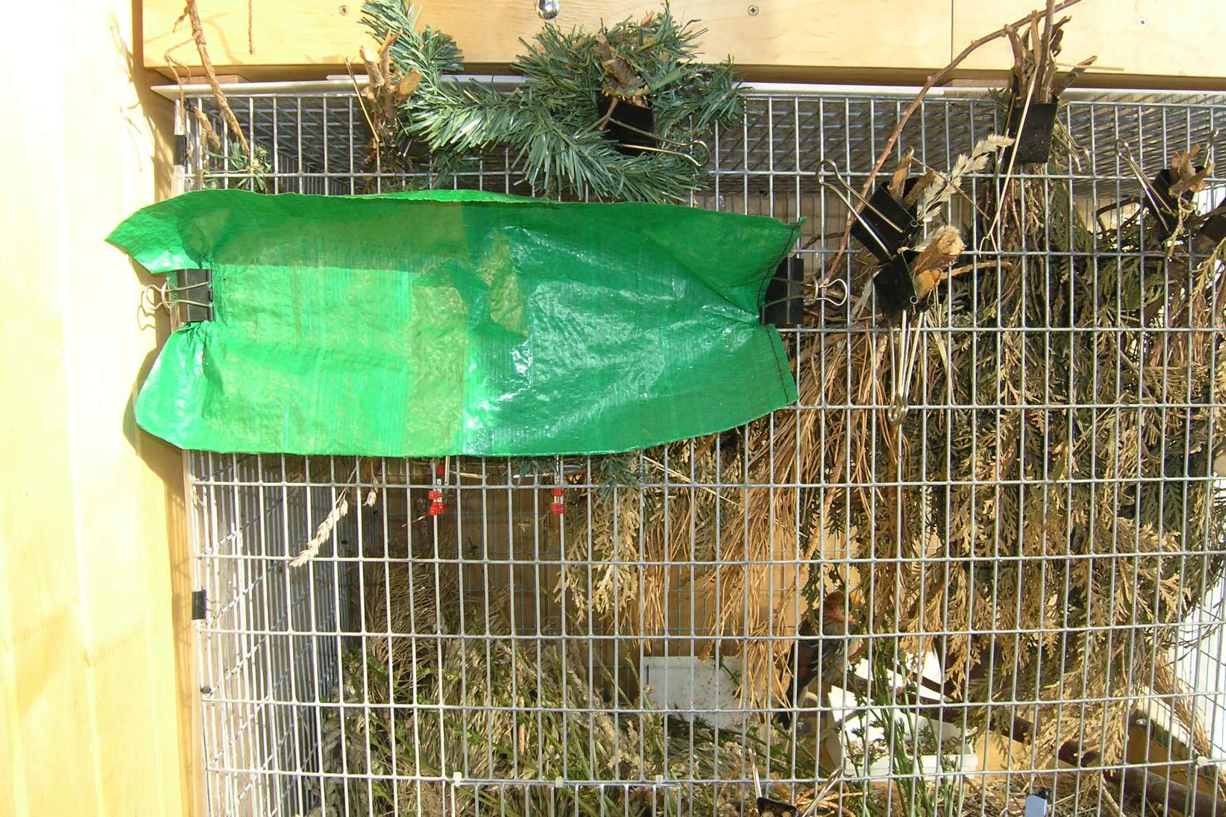 16.03.2016г. Утро – проростки, мешанка, присыпал семенами одуванчика. Утром видел, как самка щипала искусственную елку в правом гнезде. Разместил пучок травы со дна на боковой стенке в прищепке.