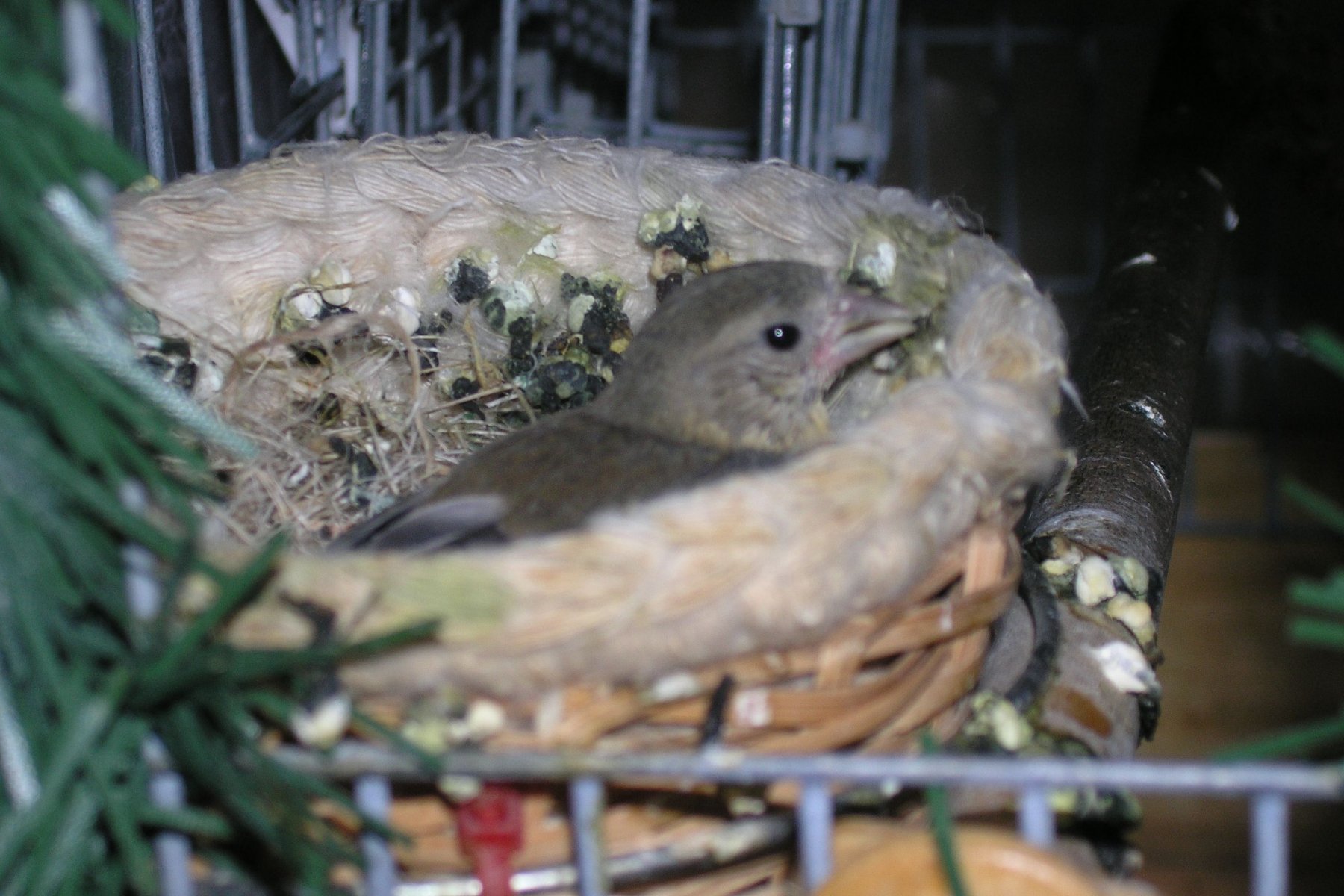 Самка активно кормила птенцов, в комнате было тепло, около 25-26 град. Когда птенцам исполнилось 6 дней самка первую ночь не ночевала в гнезде. Однако обратил внимание, что самка стала часто висеть на верхней части фронтальной сетки, перекликаться с самцом, который находился в общей пролетной клетке выше. Одним словом, она проявляла явное беспокойство, хотя птенцов кормила исправно. Наблюдал за этим пару дней, утром и вечером.