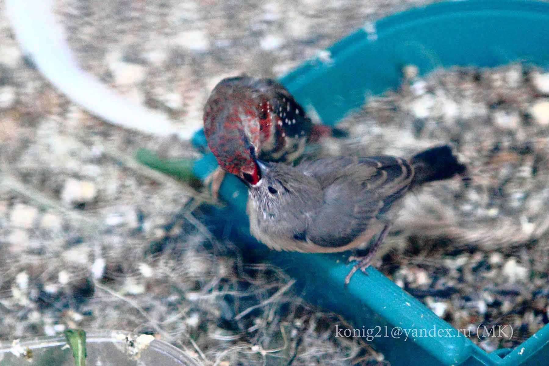 Не являюсь большим знатоком экзотов, смог опознать синеголового и фиалкового астрильдов. Если не ошибаюсь, на фото также есть тигровый астрильд с птенцом?