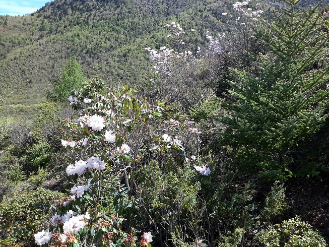 В последних экспедициях тема с масковыми снегирями стала понятна практически полностью. Отыскать этих птиц в горах для нас теперь не представляет сложности. Главное было понять в каком биотопе они проживают и что их там держит. В Тибете - это ущелья с высотой примерно 3000-3200 метров. Обычно в такой долинке имеется небольшая речка. Такое место обжито людьми. Тут есть огороженные участки с садами и огородами, а также пастбищные угодья. Долина реки со стороны гор - с заросшими обширными кустарниками, в которых дамашние животные проделали множество троп. С другой стороны - обычно находится деревня, где помимо кустарников встречаются плодовые деревья, есть пустыри - райские места для кормления птиц. Сами же горы покрыты еловыми лесами. Высокие березы, на которых кормятся снегири,находятся как раз у подножья гор, между зарослями кустарников, перемежающихся с открытыми пространствами и хвойным лесом.
