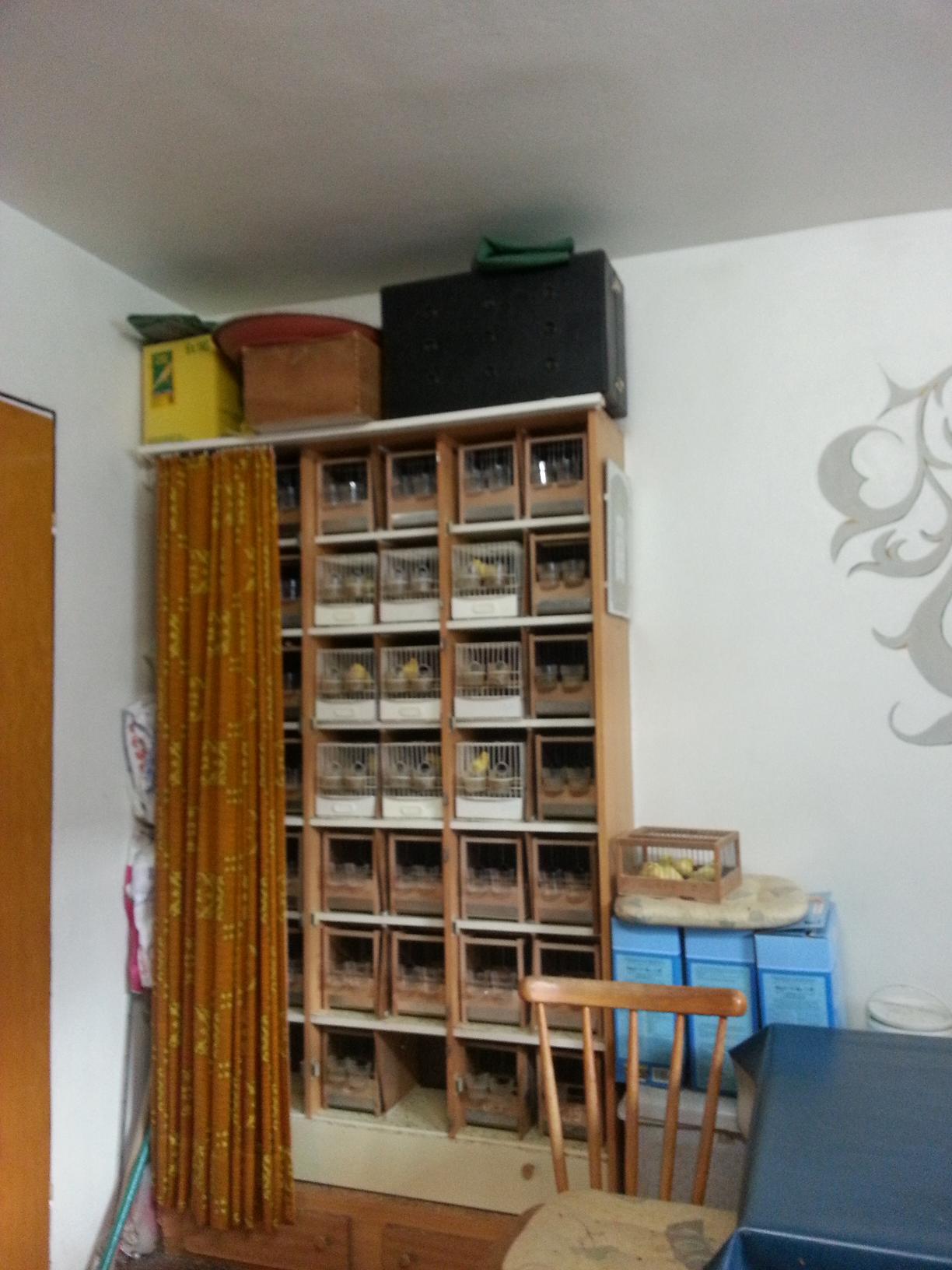 И пока самочка не закончит кладку, яйца будут ежедневно перемещаться в эту "шкатулку", в строго определенную , пронумерованную для каждого гнезда ячейку. А вместо них в гнездо будут подкладываться взамен настоящих приближенные по размеру муляжи: [hide][attachment=4]20140304_145552.jpg[/attachment][/hide]Ну, и поскольку гарцкий роллер - это все-таки певчая канарейка, и самое важный показатель - это ее песня, никак не обойтись без такого шкафа , где за закрытой шторой в маленьких клеточках сидят будущие и настоящие певцы : [hide][attachment=2]20140304_145453.jpg[/attachment][/hide]