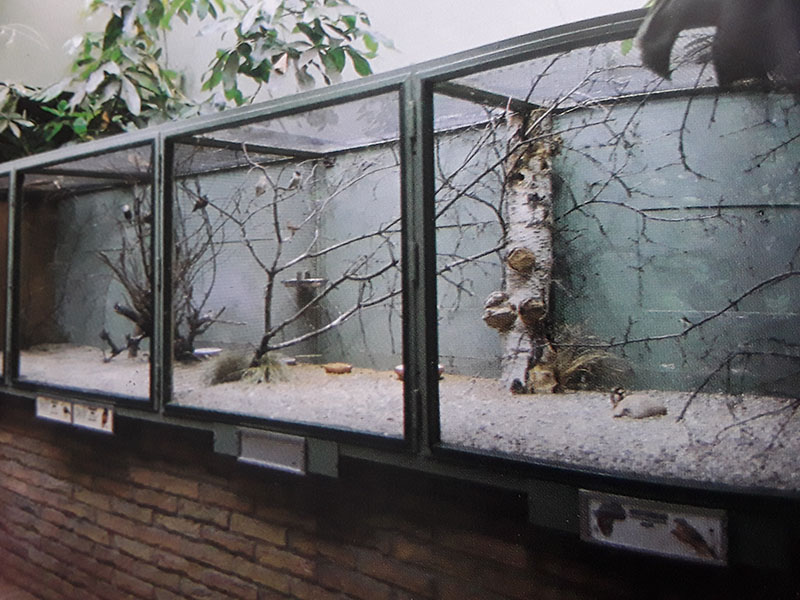 Клетки со стеклянными стенками или с одной застекленной стороной (передней) называют витринами. Эти неглубокие, но обычно высокие помещения для птиц выглядят очень эффектно, но трудоемки в обслуживании. Чаще всего витрины делают хотя бы с одной темной стенкой. Обычно это задняя. В этом случае боковые стенки застекляют не полностью, чтобы обеспечить хорошее проветривание. Чаще всего любители устраивают витрины, используя для этих целей всевозможные ниши в стенах и закрытые дверные проемы, применяя эффектную подсветку лампами дневного света. Однако в любом случае витрины не должны быть меньше 100 см в ширину, 80 см в высоту и 40 см в глубину. Если витрина будет меньших размеров, то она будет походить на аквариум. Некоторые любители очень искусно декорируют свои витрины. У задней стенки они помещают длинные узкие плошки с хорошим дренажем и питательной почвой, в которые сажают различные растения. Повыше помещают ветки, а в углу ставят снопик тростника или высокой травы. Выглядят такие витрины очень хорошо, и в посаженных растениях тоже есть резон, так как они очищают воздух от пыли и поддерживают влажность в витрине, что играет немаловажную роль в жизни птиц.