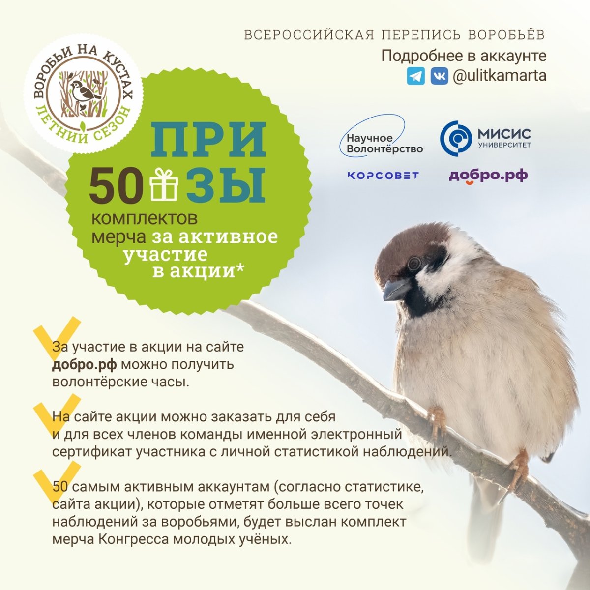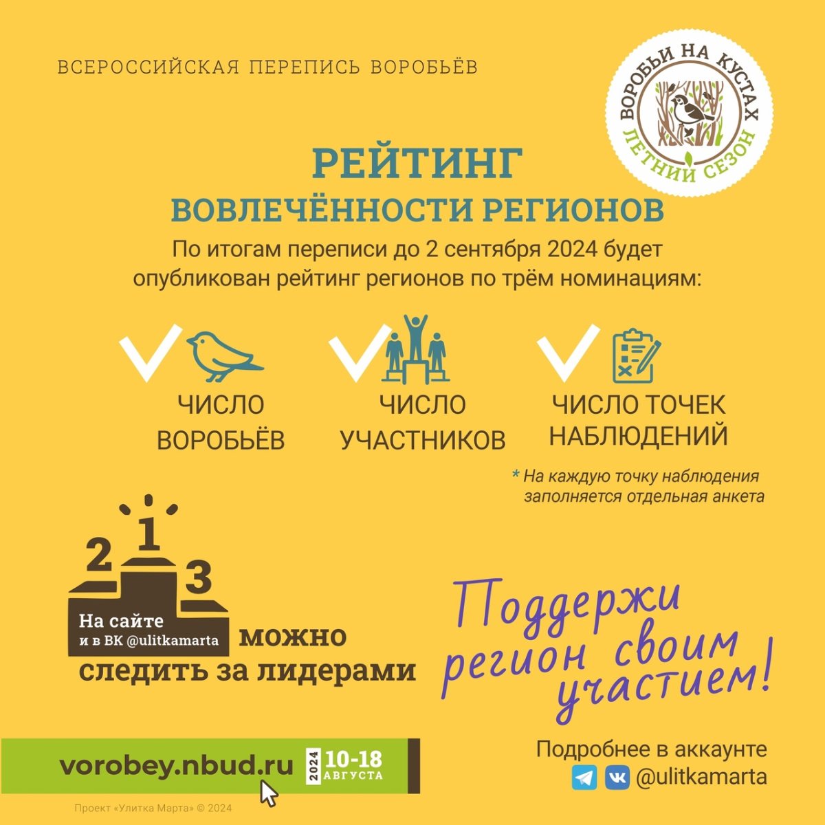 Приглашаем к участию в летнем сезоне ВСЕРОССИЙСКОЙ ПЕРЕПИСИ ВОРОБЬЁВ «Воробьи на кустах», который состоится с 10 по 18 августа 2024.