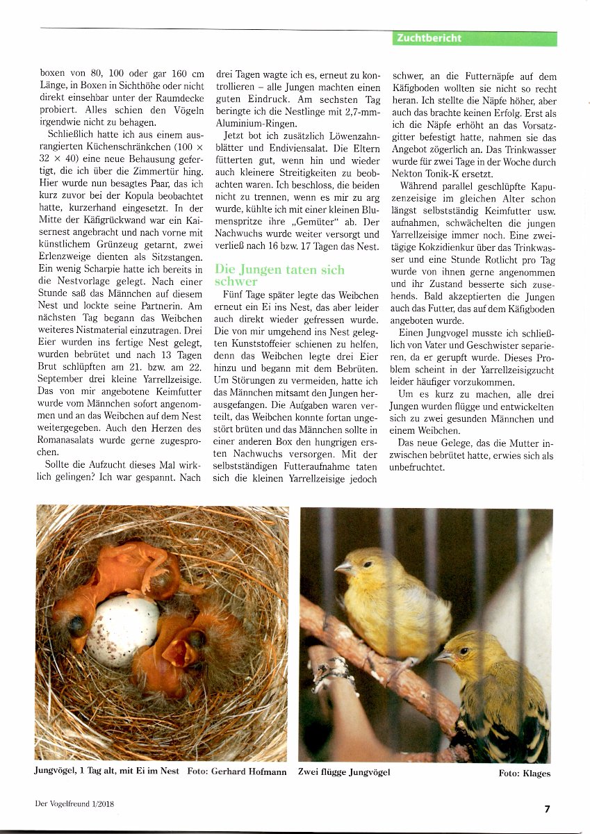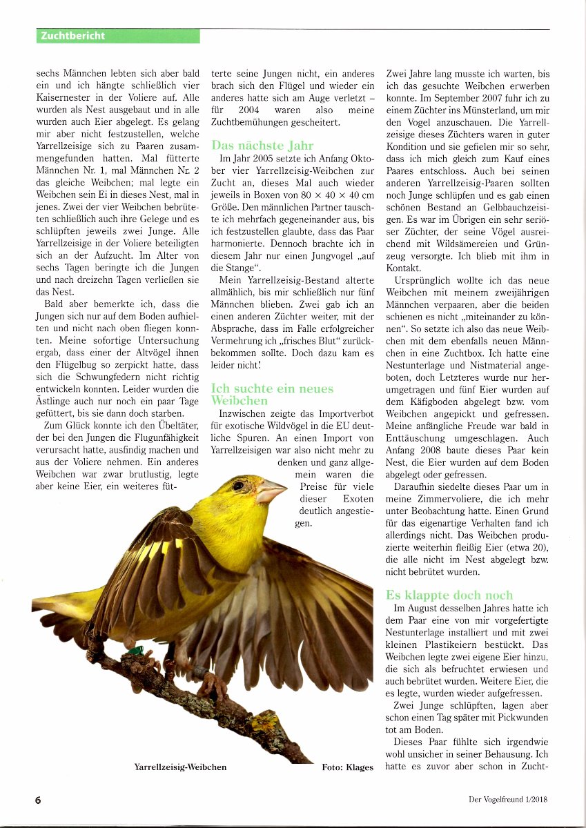 В дополнение к более чем успешному российскому опыту разведения яреллей Геннадия и Алексея-зелёного, статья из последнего журнала "Der Vogelfreund". Ведь этот вид чижей в Европе очень популярен и любим.