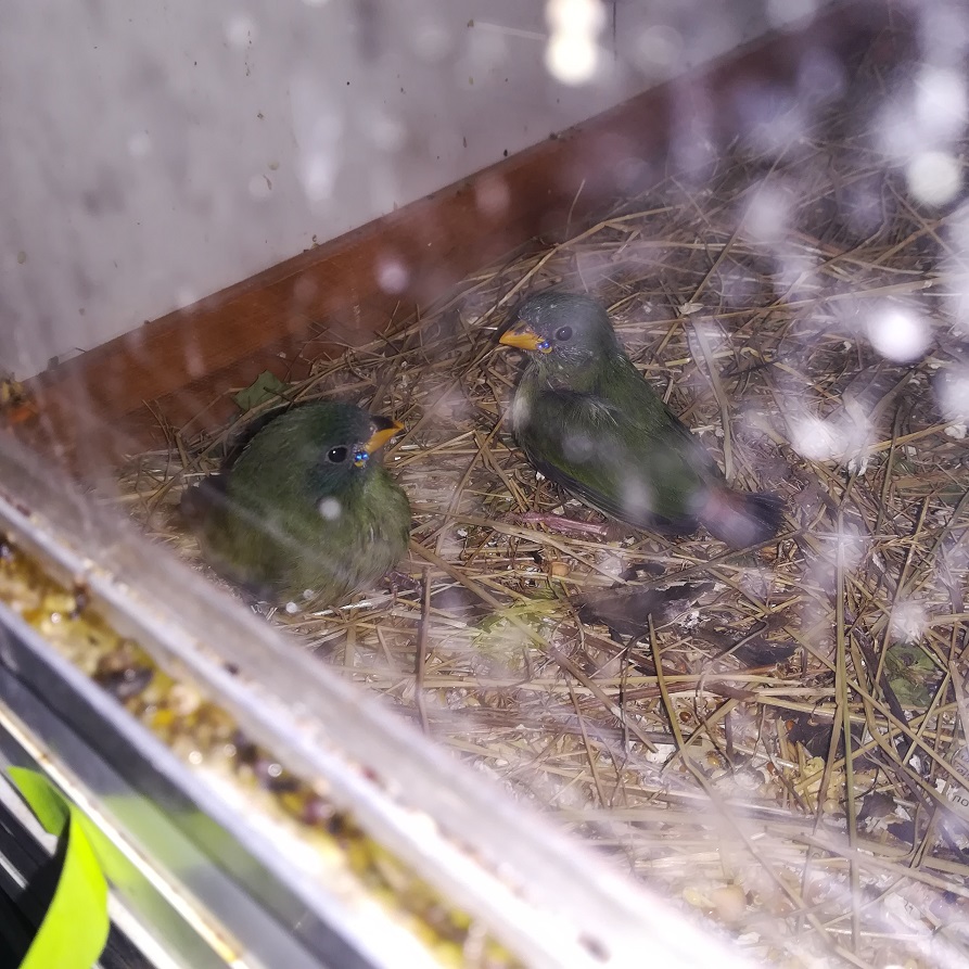 Птенцы вылетели из гнезда очень рано, как только чуть оперились и где-то 5-6 дней сидели на земле по уголкам. По вольеру ходить было страшно, как бы не наступить. Сейчас уже взлетели на ветки. С момента вылупления это настоящие партизаны - всегда молчат и очень незаметно себя ведут.