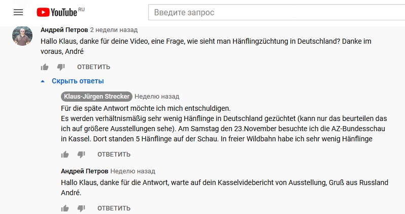 Здравствуйте любители птиц.Евгений я у Клауса за коноплянку спрашивал.Вот ответ.