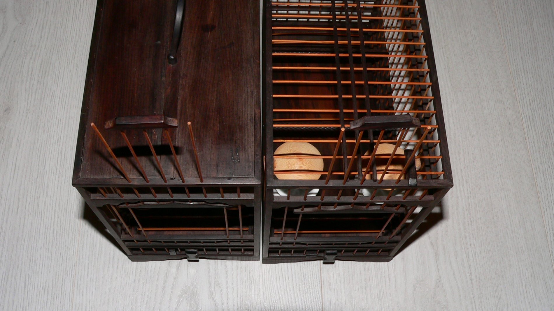 Эти клетки - мастера из южного Китая. Выполнены в традиционном стиле. При своих небольших размерах может быть полноценным жильем для птички размером с чижа, серого вьюрка,белоглазки...