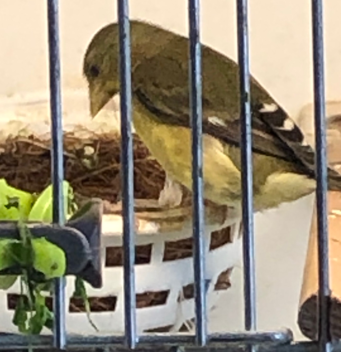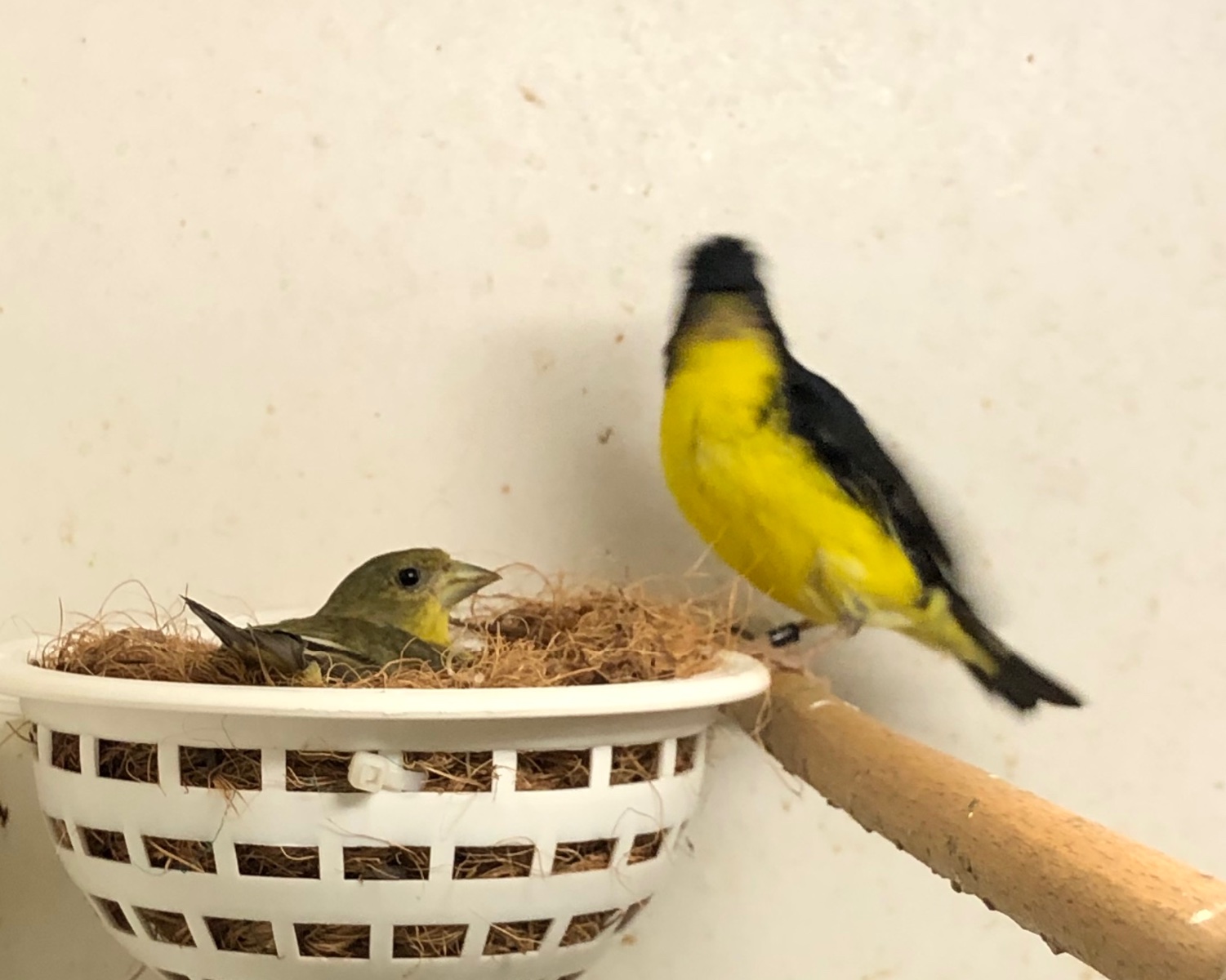 В продолжения сезона разведения. Колумбийский подвид мексиканского чижа, молодая самка выведенная мною в прошлом году за строительством гнезда.