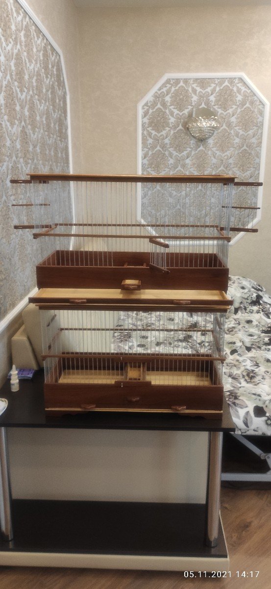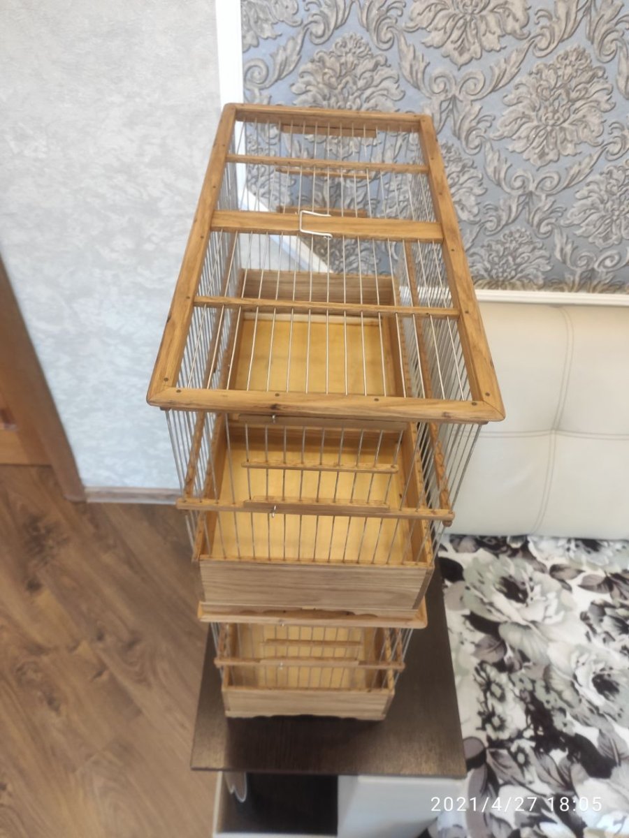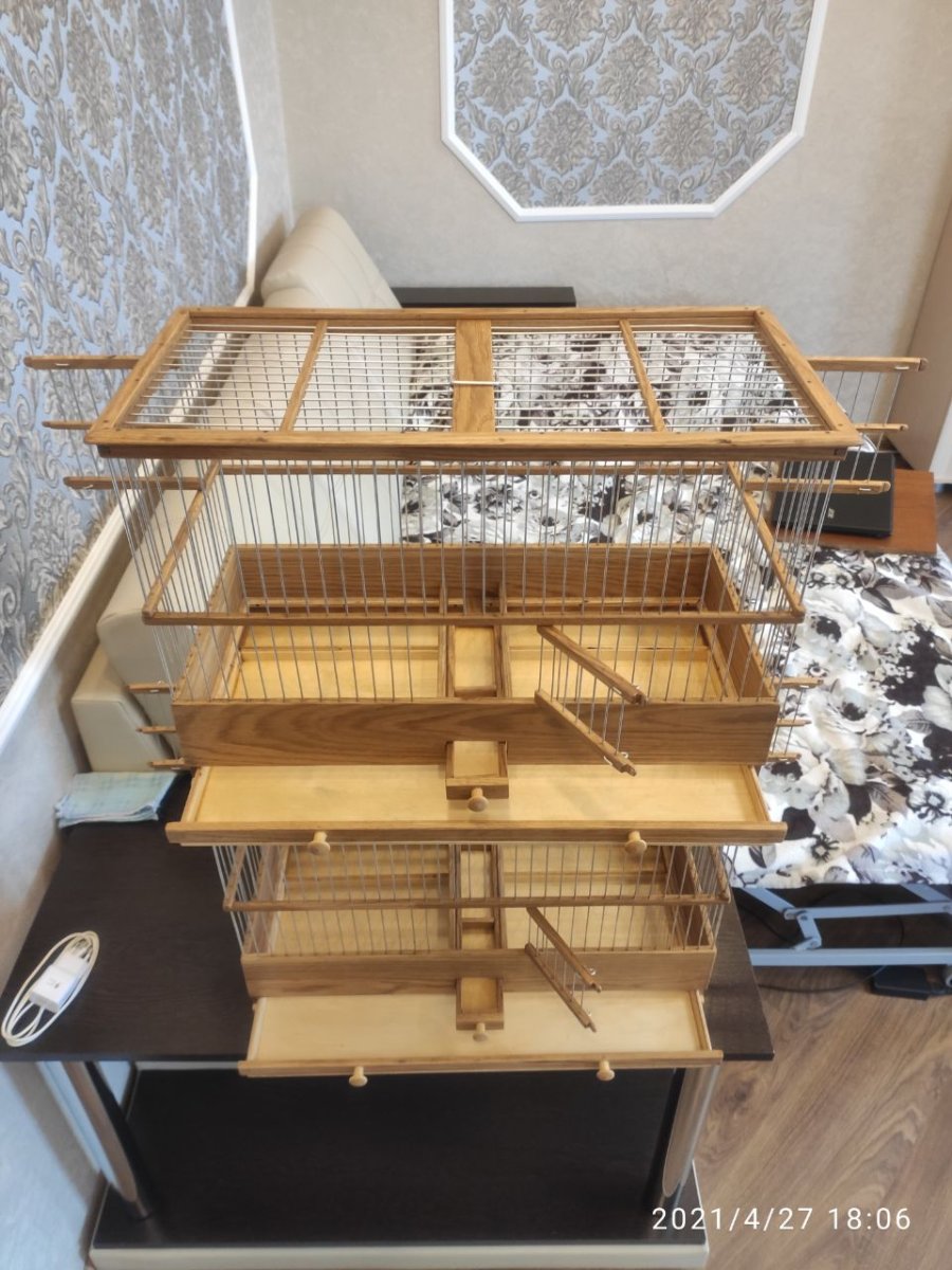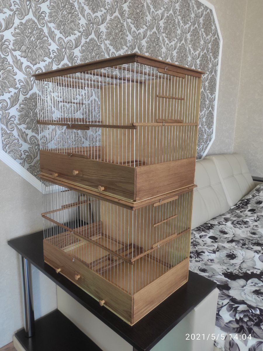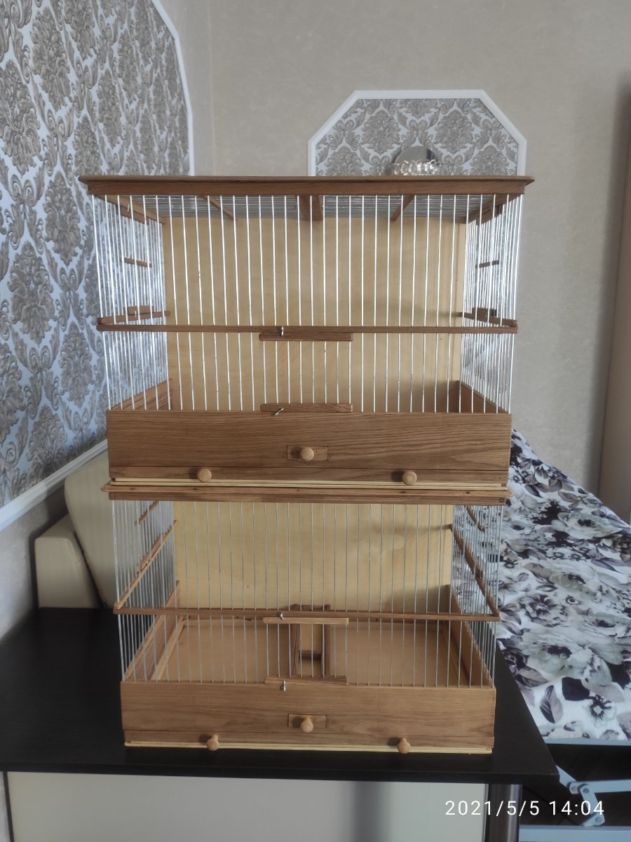 Здравствуйте уважаемые форумчане!Выкладываю на общее обозрение и обсуждение четыре клетки все клетки сделаны в разные города России.Клетки все сделаны из дуба,спицы диаметром 1,6мм пищевая дюраль Фанера влагостойкая 4мм.Клетки все пропитаны пинотексом и покрыты в два слоя лаком для яхт.Размер клеток две 600×270×380мм одна без выдвижного дна и кормушки по желанию заказчика ,а также верх клетки классический.Две верхние одна размер 500×240×340мм верх прямой с карнизом.Самая верхняя клетка размер 400×210×260мм.Кормушки в клетках по центру и дно выдвигается вперёд!Критика принимается,но в меру!К замечания прислушиваюсь!Хотя клетки делаю давно.Но как говорится век живи и век учись!Спасибо всем кто следит за моими работами!Удачи и здоровья всем!