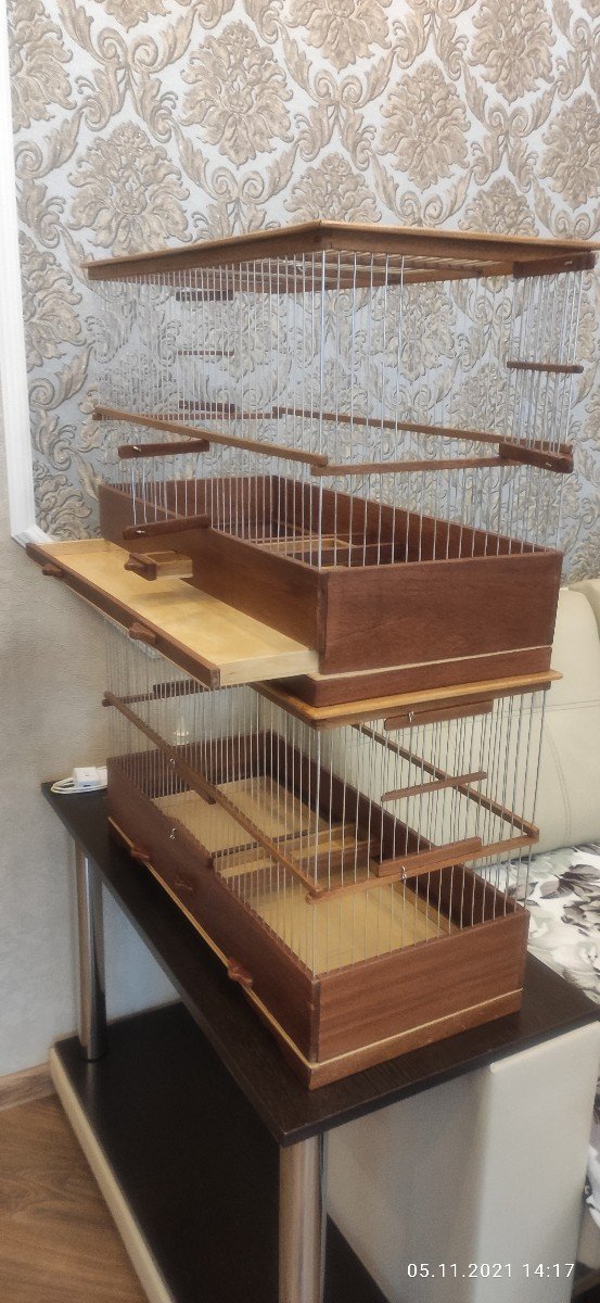 Размер 700×360×400мм дерево дуб, фанера влагостойкая. Спицы пищевая дюраль диаметр 1,6мм, расстояние между спиц по центрам 14мм. Клетка имеет 4 двери, две с боков и две с фронта в нижнем ярусе. Кормушка тоже по центру и два дна выдвижных. Клетки с прямым верхом и карнизом. На клетке для дрозда верх глухой фанера 4мм.